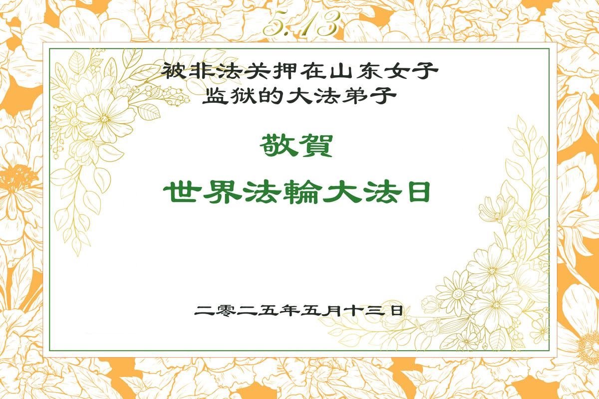 感恩师尊的慈悲苦度,弟子叩拜师尊。 山东烟台市一大法弟子 二零二五年五月十三日 被非法关押在山东女子监狱的大法弟子庆祝世界法轮大法日!
