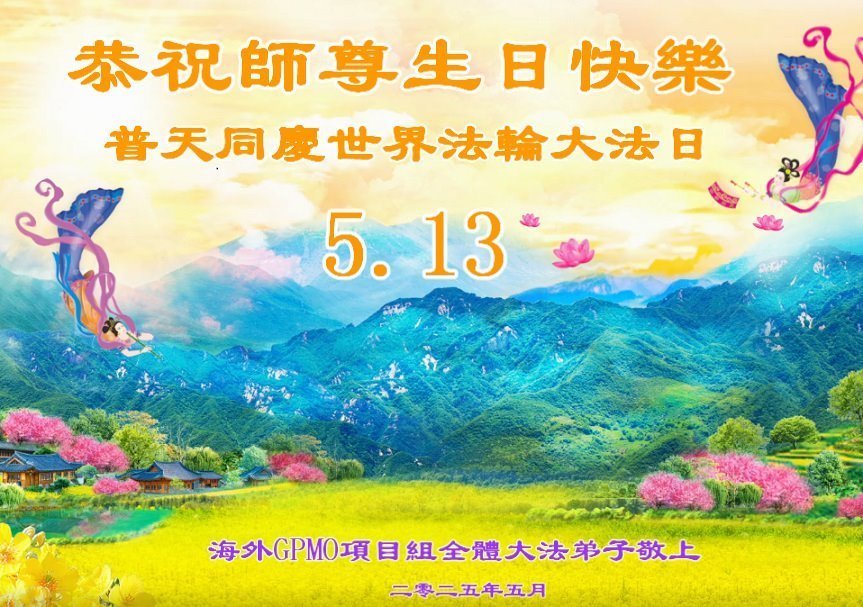 法轮大法好,真善忍好。 师父好。恭祝师尊生日快乐! 大陆大法弟子敬上 二零二五年五月十日 大陆大法弟子普天同庆世界法轮大法日及恭祝师尊华诞!