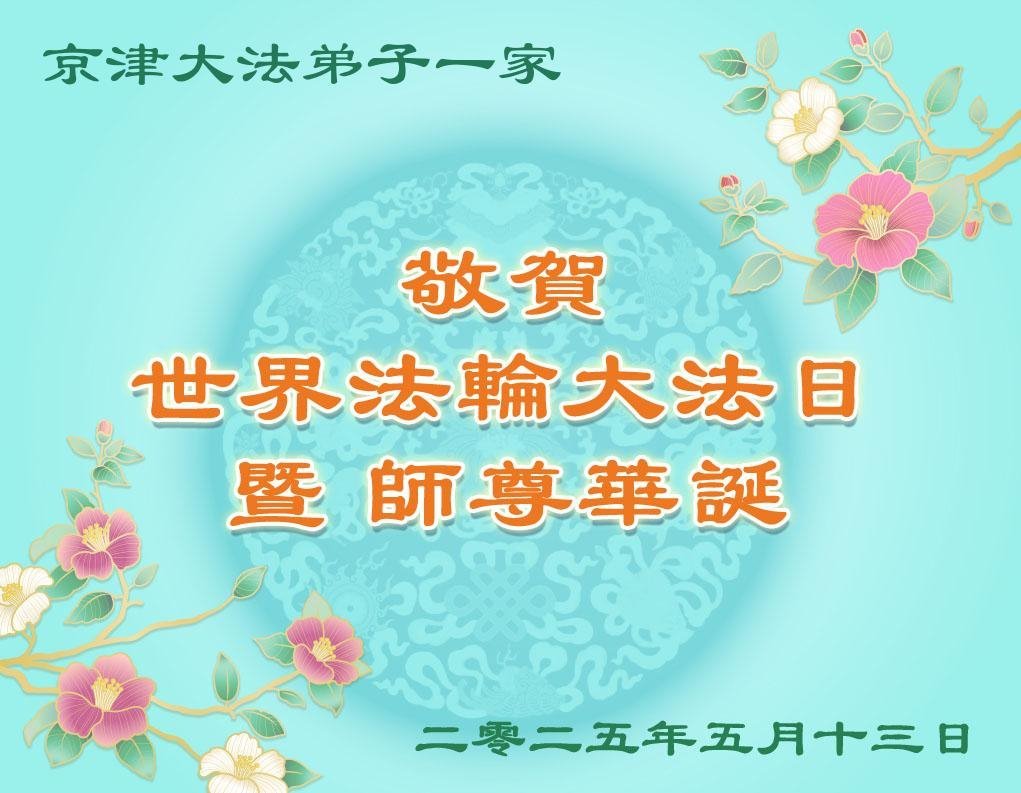 敬贺世界法轮大法日!恭祝师尊生日快乐!感恩师尊洪传大法,感恩师尊慈悲苦度。 京津七名大法弟子携家人敬上 二零二五年五月十日 中国大陆一大法弟子恭贺世界法轮大法日!恭祝师父生日快乐!