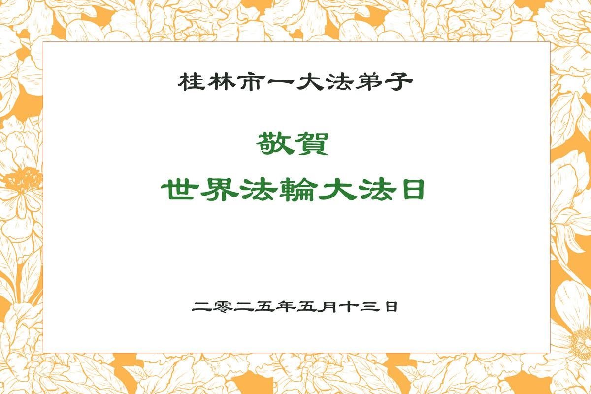 弟子无限感恩师尊慈悲苦度!在最后有限的时间里,弟子会努力实修好自己,跟上师父正法進程,做好三件事,兑现使命! 弟子叩谢师尊! 宁乡一大法弟子(政府部门退休干部) 二零二五年五月十日 广西壮族自治区桂林一大法弟子恭贺世界法轮大法日暨师尊华诞!