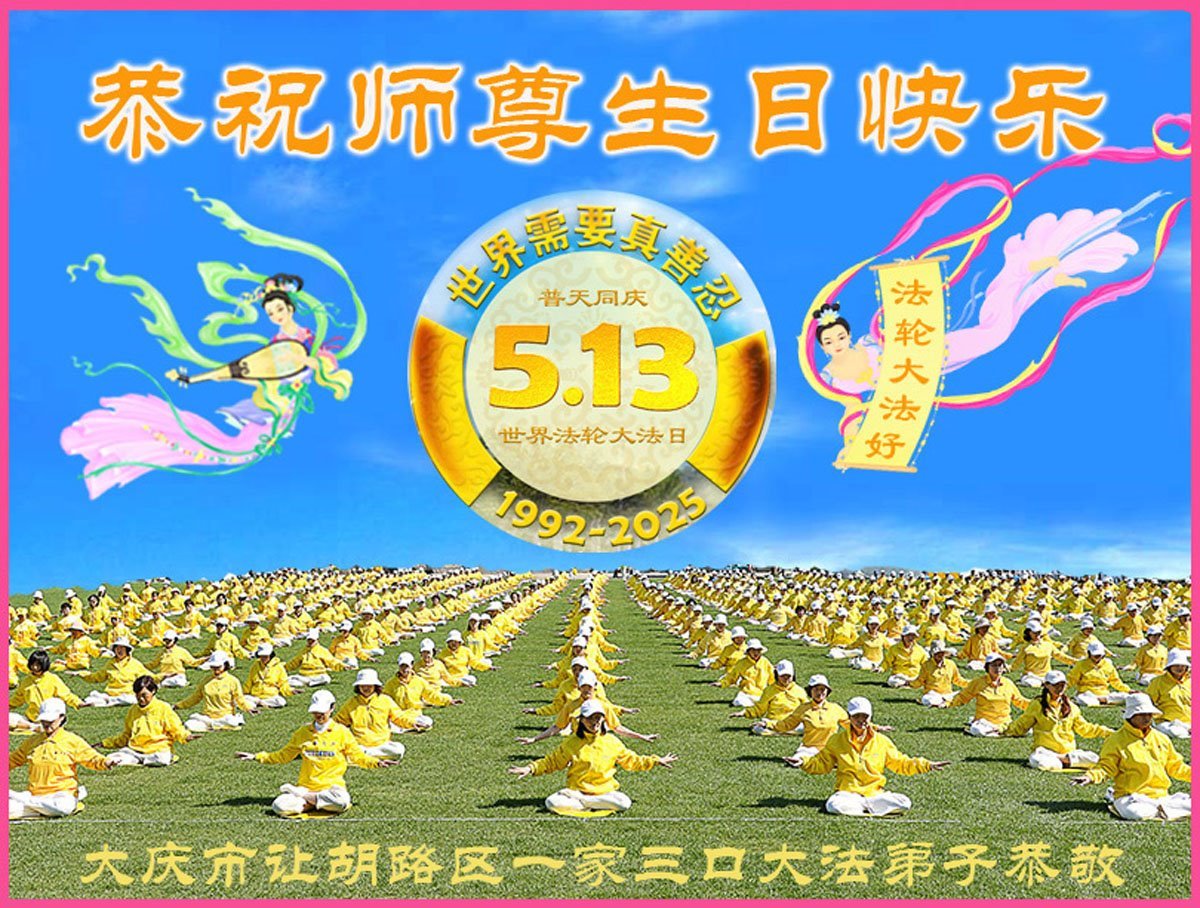 黑龙江省大庆市一大法弟子代表一家九位大法弟子及家人们感恩师尊的慈悲救度,跪拜师尊!恭祝师尊生日快乐!祝贺世界法轮大法日!恭贺法轮大法洪传33周年! 黑龙江大庆一大法弟子 二零二五年五月十二日 黑龙江省齐齐哈尔市富拉尔基区大法弟子恭祝慈悲伟大的师尊生日快乐!