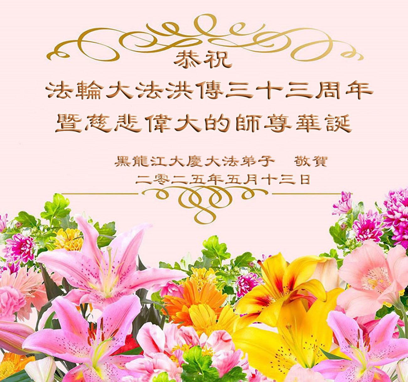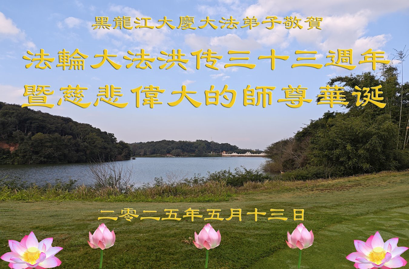黑龙江省大庆大法弟子恭祝法轮大法洪传三十三周年暨慈悲伟大的师尊华诞!