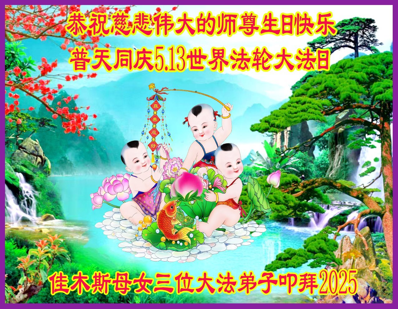恭祝慈悲伟大的师尊生日快乐! 恭贺世界法轮大法日!普天同庆! 黑龙江省鸡西市虎林市大法弟子 二零二五年五月十二日 黑龙江佳木斯母女三位大法弟子恭祝慈悲伟大的师尊生日快乐!