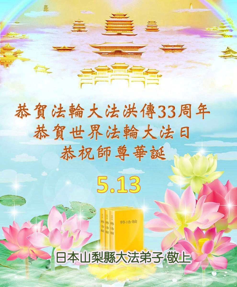 感恩师父给我们希望和力量,安排不同的人来点化我们,催我们成长,形成整体,互相鼓励。 日本山梨县大法弟子恭祝师尊生日快乐!普天同庆世界法轮大法日!