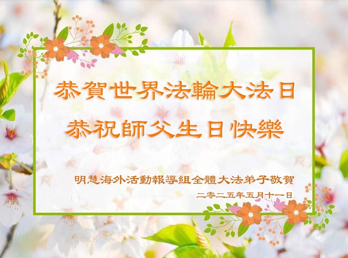【明慧网二零二五年五月十六日】 明慧海外活动报导组大法弟子恭祝师父生日快乐!恭贺世界法轮大法日!