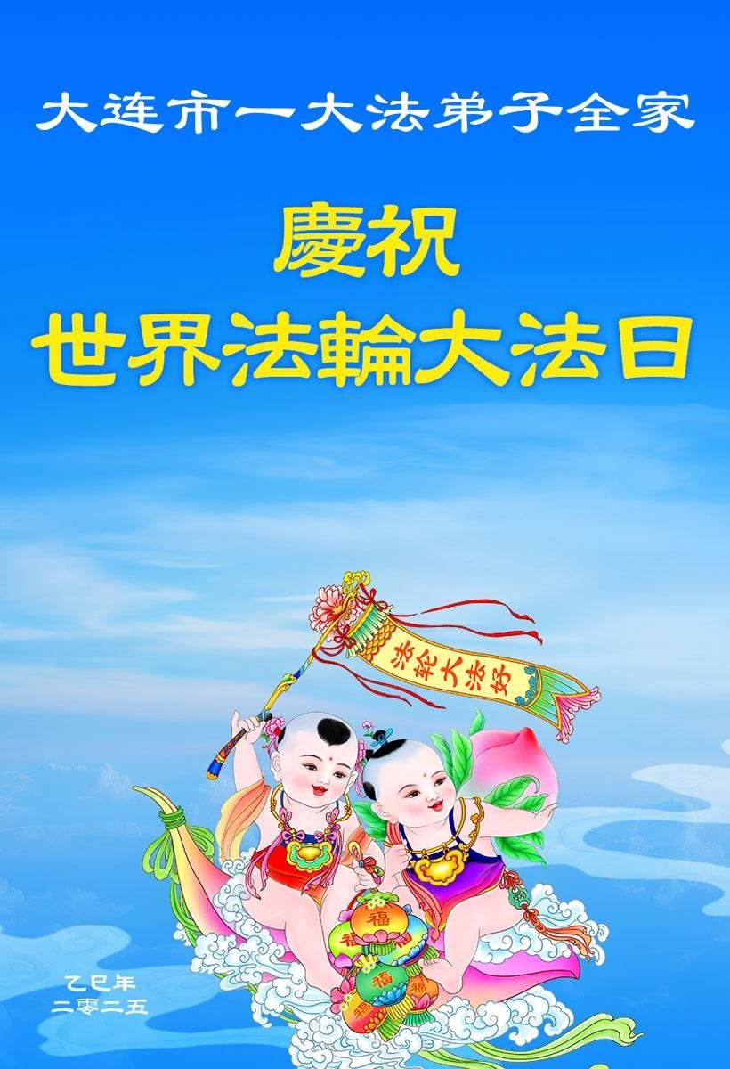 在世界法轮大法日到来之际,我们大连市两位大法弟子敬贺世界法轮大法日!恭祝慈悲伟大的师尊生日快乐!弟子只有学好法,多救人,精進再精進,报答师尊的救度圣恩! 辽宁省大连市一大法弟子全家恭贺世界法轮大法日!