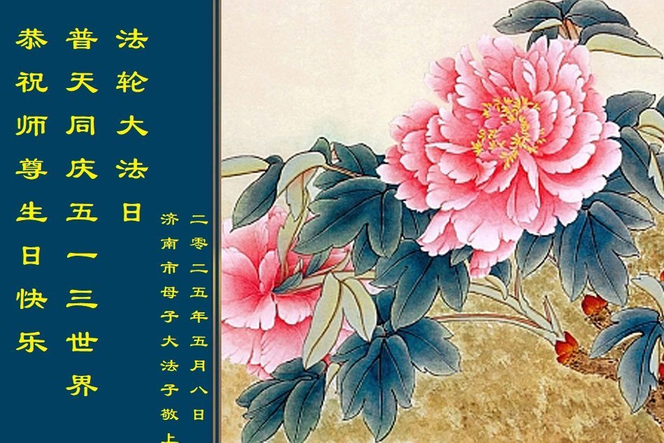 恭祝师尊生日快乐!感恩师尊慈悲救度!恭贺大法洪传33周年暨世界法轮大法日! 山东省济南市一母子大法弟子恭祝师尊生日快乐!