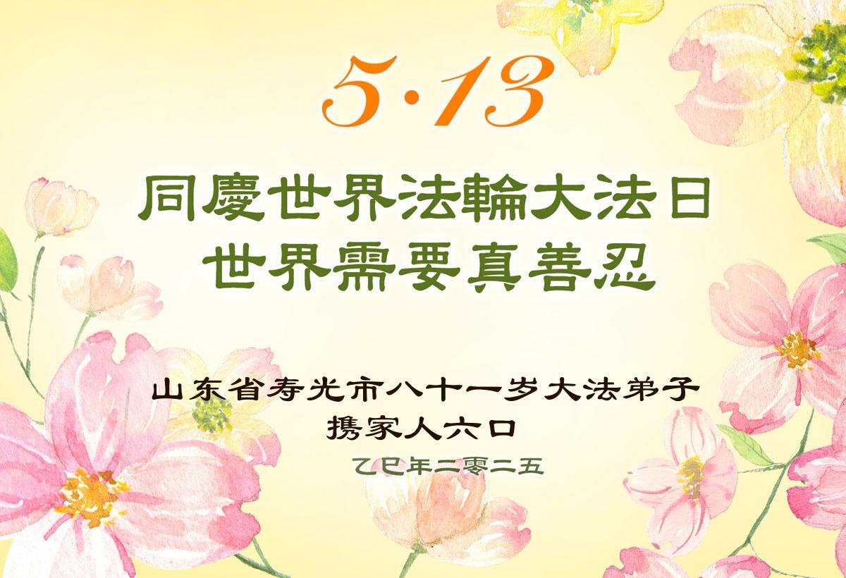 山东省潍坊市临朐县五井镇一大法弟子全家恭贺世界法轮大法日!恭祝师父生日快乐!