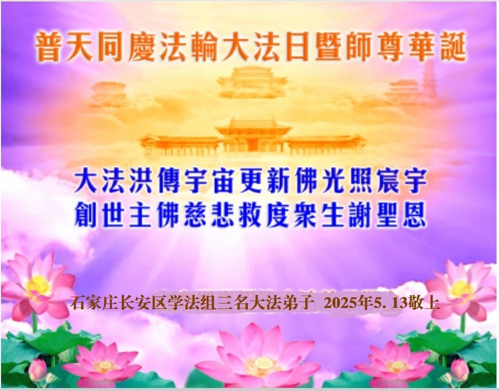 【明慧网二零二五年五月十七日】 天津市津南区一大法弟子恭贺世界法轮大法日!恭祝师尊生日快乐!
