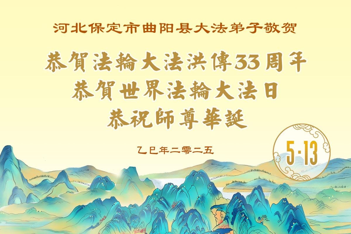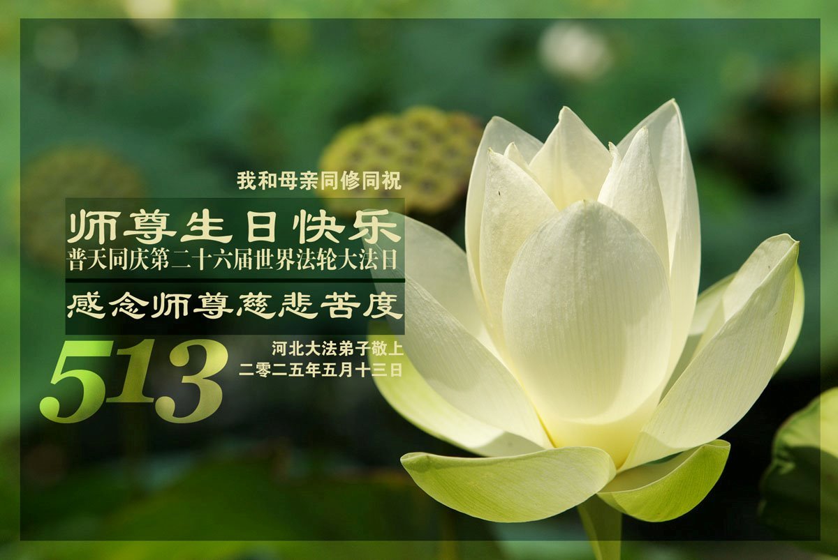 感恩师尊慈悲救度!我和母亲同修有决心形成整体,更好的助师正法、救度众生。 河北保定市曲阳县一学法小组大法弟子恭贺世界法轮大法日暨师父华诞!