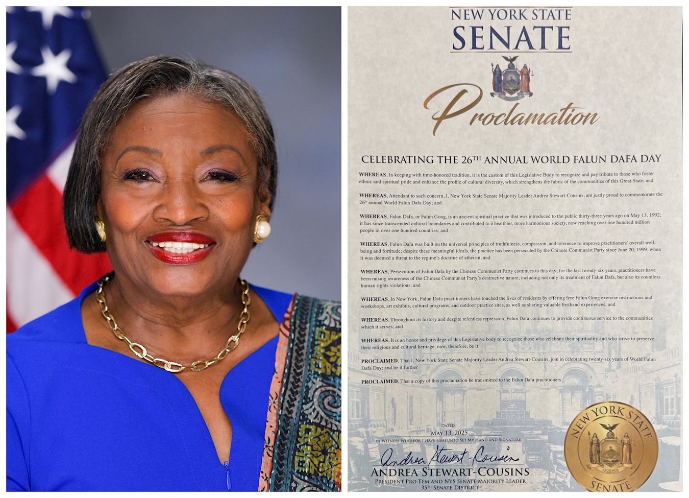 | 【明慧网二零二五年五月十七日】二零二五年五月十三日是第二十六届“世界法轮大法日”暨法轮大法弘传世界三十三周年纪念日,更是慈悲伟大的法轮功创始人李洪志大师华诞。纽约州五十多位政要发来褒奖贺信,包括三位国会议员、十四位州参议员、十四位州众议员及二十三位地方政要。 他们向李洪志大师致敬,宣布同庆法轮大法日,颂扬大法以真、善、忍为根本原则引领上亿人心灵升华、促进个人的整体福祉与内在祥和;同时感谢法轮功修炼群体对纽约州社区的卓越奉献。 在纽约州参议院,由州参议院商业、经济发展与小型企业委员会首席成员、第3区参议员迪恩‧穆雷(Dean Murray)提案、其他九位参议员联署的《第243号决议案》获得通过,庆贺第二十六届世界法轮大法日。州参议院临时议长、多数党领袖安德里娅‧斯图尔特-考辛斯(Andrea Stewart-Cousins)等四位参议员也颁授嘉奖令或发来贺信祝贺“第二十六届世界法轮大法日”。 纽约州参议院通过决议案 庆贺大法日 纽约州参议院于二零二五年一月二十二日正式通过《第243号决议案》,以庆贺二零二五年五月十三日“第二十六届世界法轮大法日”。 此决议由第3区参议员迪恩。穆雷(Dean Murray)发起,其他九位州参议员联署,他们是:州参议院少数党副领袖安德鲁‧兰扎(Andrew J. Lanza,第24区)、少数党助理领袖约瑟夫。格里佛(Joseph A‧Griffo,第53区)、迪恩‧穆雷(Dean Murray,第3区)、雅各布。阿什比(Jacob Ashby,第43区)、乔治‧博雷洛(George M. Borrello,第57区)、杰克‧马丁斯(Jack M. Martins,第7区)、彼得‧奥伯拉克(Peter Oberacker,第51区)、托马斯‧奥马拉(Thomas F. O’Mara,第58区)、史蒂文‧罗德斯(Steven D. Rhoads,第5区)和詹姆斯‧泰迪斯科(James Tedisco,第44区)。详情请点閱相关报道:《纽约州参议会通过决议案 庆祝世界法轮大法日》 州参议员多数党领袖:祝贺第二十六届世界法轮大法日  图1:州参议院临时议长、多数党领袖、第35区议员安德里娅。斯图尔特-考辛斯(Andrea Stewart-Cousins)颁发褒奖令。 |