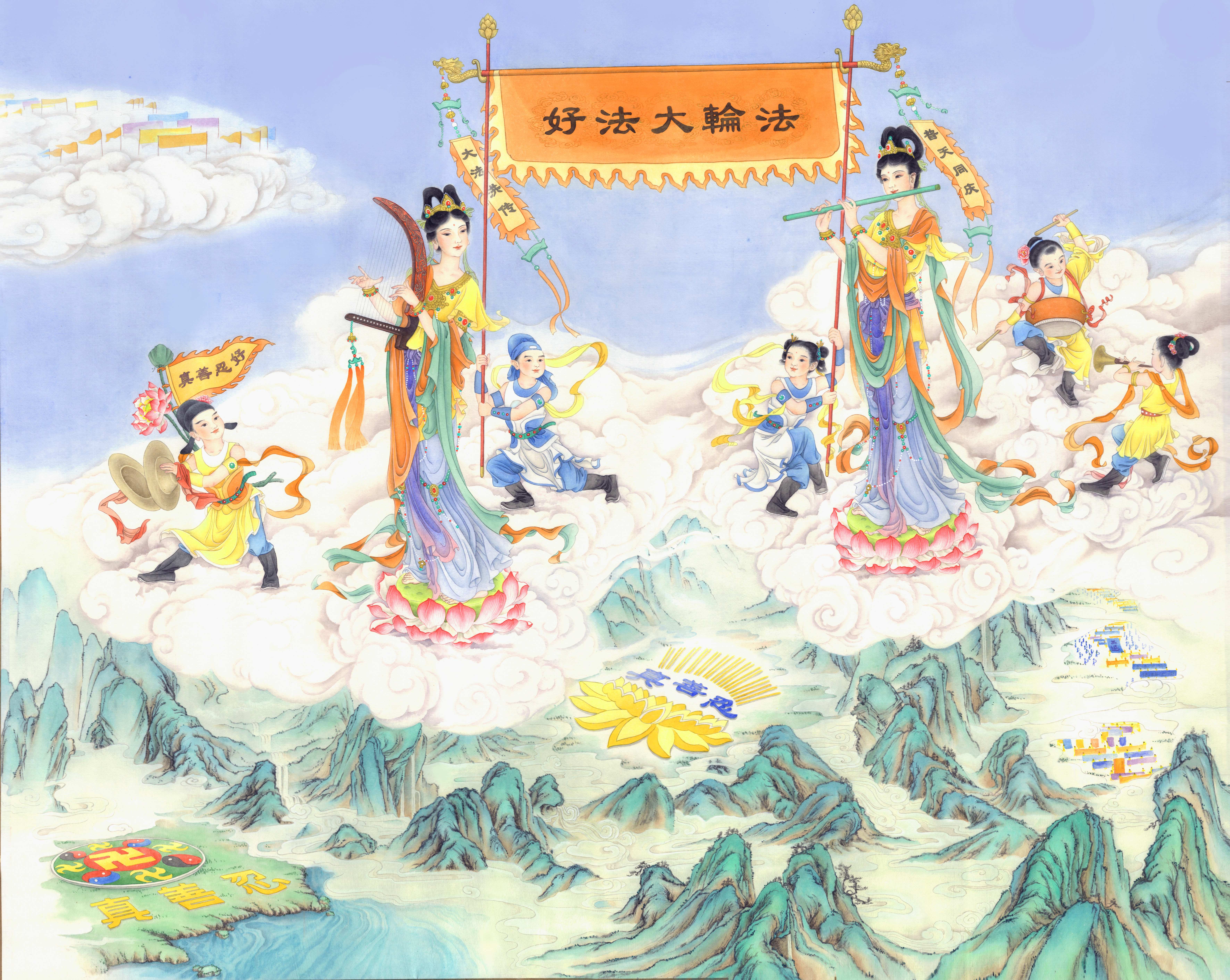 山水中也加入了大法学员举条幅游行的队伍(右下方)。意在表现一幕天上人间不同时空、不同地域同庆“世界法轮大法日”的节庆景象。