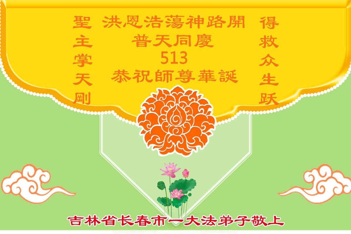 普天同庆、同贺513世界法轮大法日暨师尊生日快乐! 5月13日是神圣的日子! 5月13日是师父传法三十三周年! 5月13日是师父生日,弟子恭祝师尊生日快乐! 如今神韵艺术团用精湛技艺、绚丽多彩的舞蹈,无与伦比、美不胜收的世界精品艺术佳作,奉献给众生。人人看了喜开怀,对未来充满希望,人、神、一切的一切都有救了,这都是来源于创世主的恩典。《转法轮》的光辉洒满穹宇,得者喜之,闻者寻之,将永存弟子心田。《转法轮》佛法无边,世界需要真、善、忍。回归传统,信神才有未来更美好。众生永远永远记住这神圣的日子513。 吉林省长春一大法弟子敬上 二零二五年四月二十二日 吉林省长春市大法弟子恭贺世界法轮大法日!