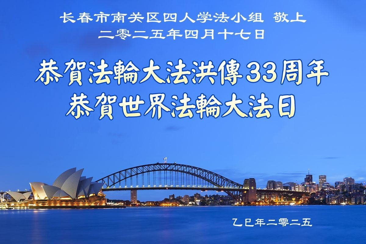 恭贺法轮大法洪传三十三周年!在513到来之时,我们四名大法弟子就听师父的话,多学法,学好法,发好正念,多救人,做好三件事,完成历史使命,不辜负师父的期望,做师父的真修弟子。谢谢师尊! 吉林省长春市大法弟子恭贺世界法轮大法日!