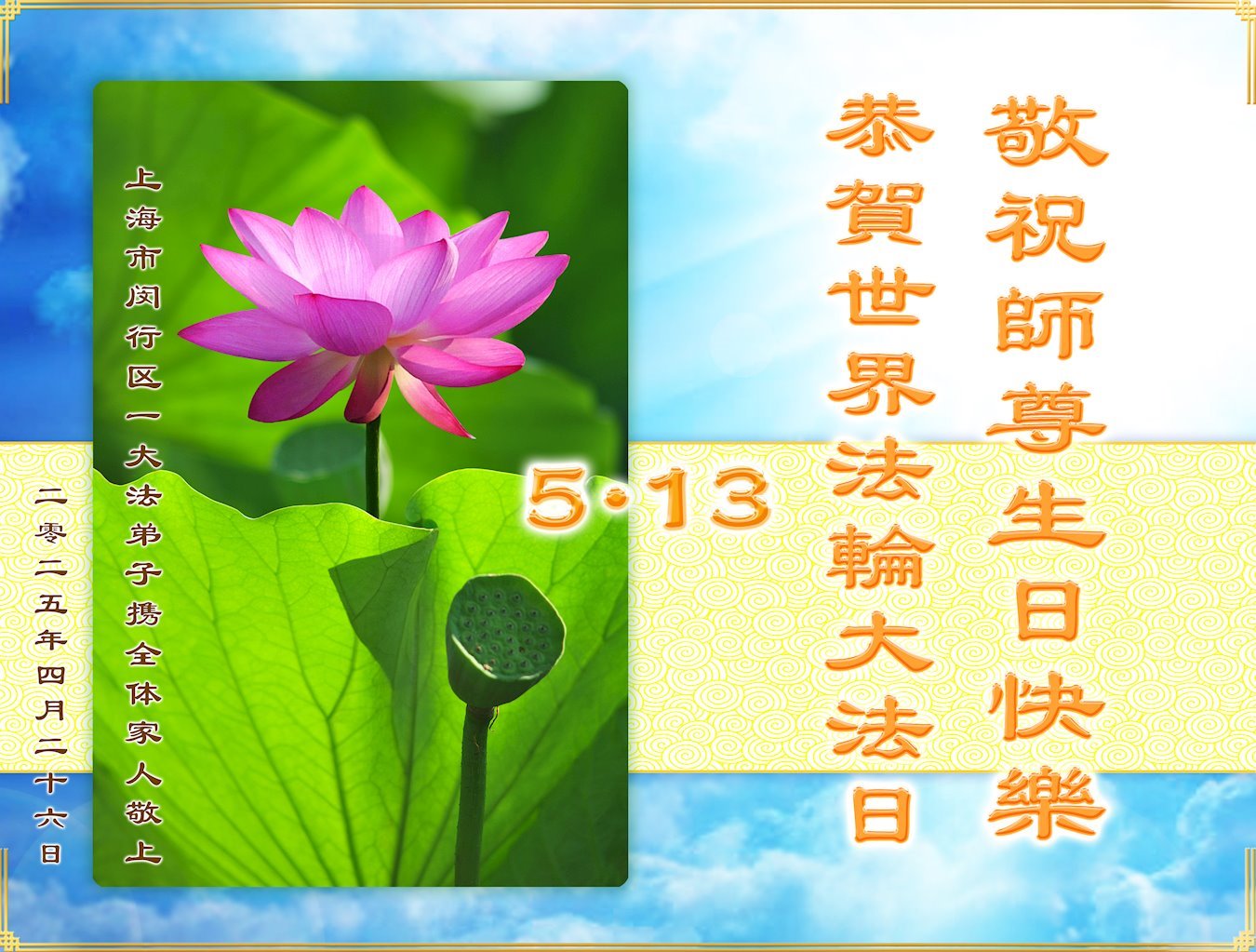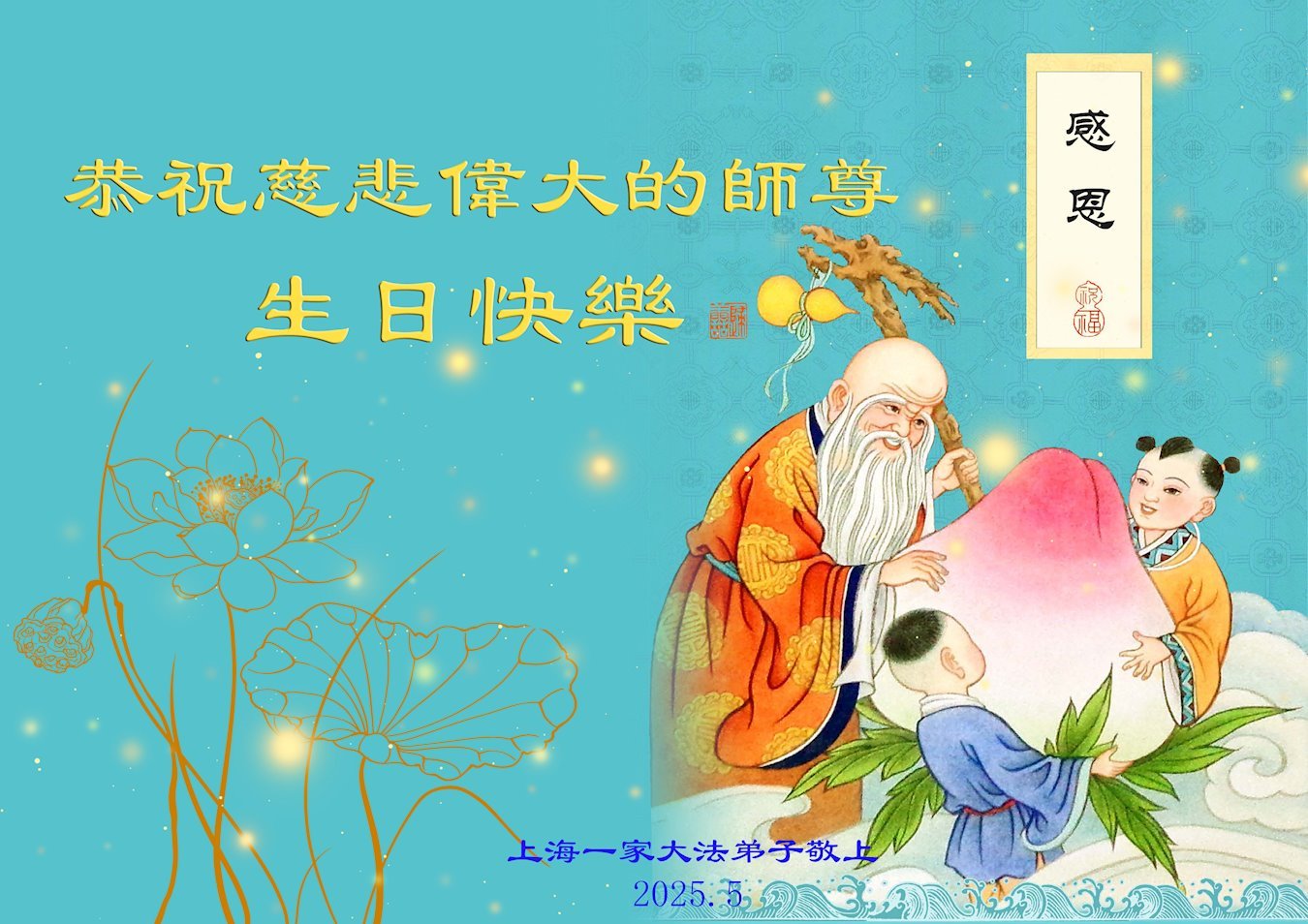 敬祝慈悲伟大的师尊生日快乐!同贺5.13世界法轮大法日! 师尊辛苦了!师尊大慈大悲救度弟子,保护弟子家人!弟子感谢师恩! 上海市闵行区一大法弟子携全体家人敬上 2025年4月26日 上海一家大法弟子恭贺世界法轮大法日暨慈悲伟大的师父生日快乐!