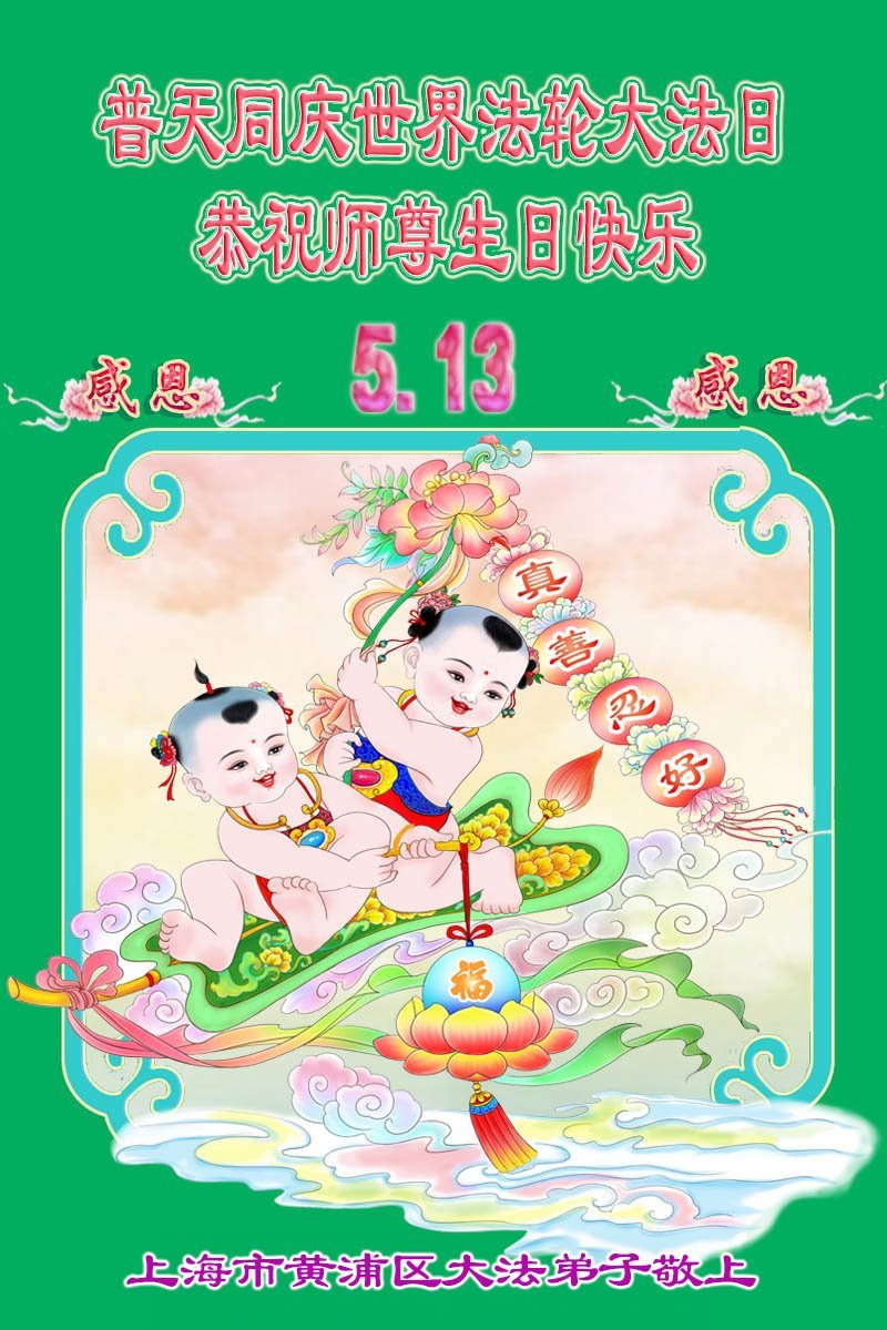 恭贺世界法轮大法日! 恭祝慈悲伟大的师父生日快乐! 上海一家大法弟子敬上 上海一大法弟子恭贺世界法轮大法日暨慈悲伟大的师父生日快乐!