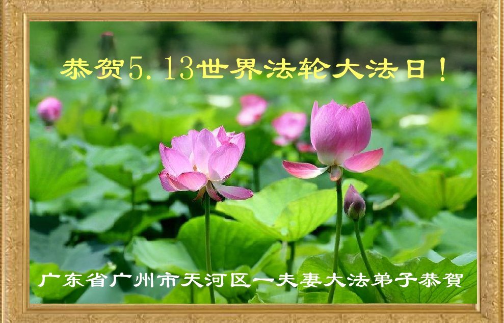 同贺5.13世界法轮大法日!恭祝慈悲伟大的师尊华诞! 广东省广州市天河区大法弟子敬上 广东省广州市天河区一夫妻大法弟子恭贺513世界法轮大法日!