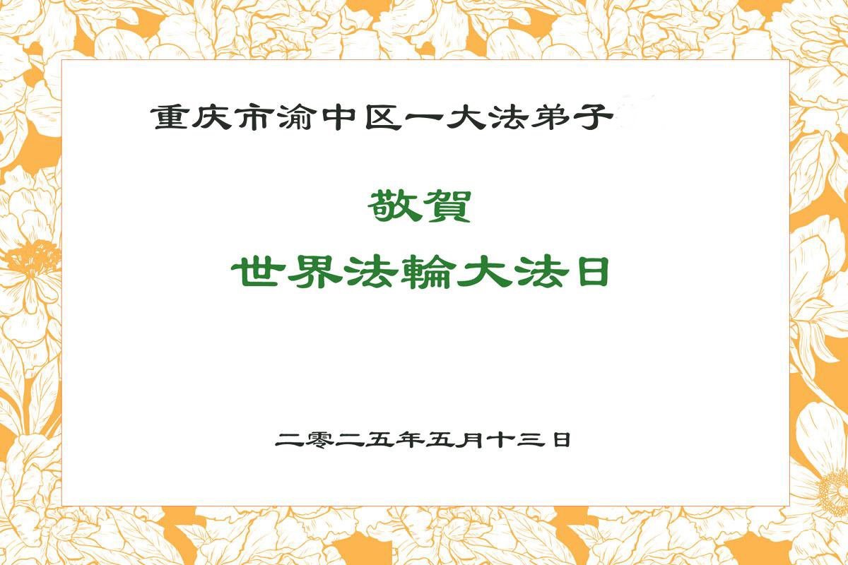 重庆市渝中区一大法弟子恭贺世界法轮大法日!恭祝慈悲伟大的师尊生日快乐!
