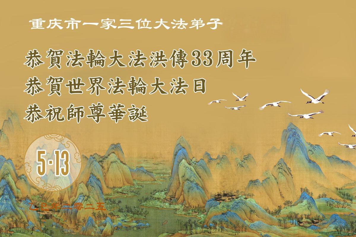恭祝慈悲伟大的师尊生日快乐! 恭贺世界法轮大法日!普天同庆! 永永远远感恩伟大师尊的慈悲救度!圣恩浩荡! 重庆市一家三位大法弟子敬上 2025年4月19日 重庆市一家三位大法弟子恭贺世界法轮大法日!