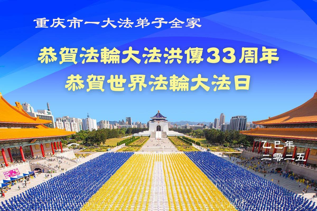 恭贺世界法轮大法日!这是宇宙最伟大辉煌的日子!是弟子们感恩的日子!师恩浩荡的日子! 恭祝慈悲伟大的师尊生日快乐! 感恩慈悲伟大的师尊处处保护着弟子、保护着弟子,弟子只有真修实修做好该做的。弟子全家感恩师尊!盼望师尊早日回国团聚! 重庆市一大法弟子全家敬上 二零二五年四月十九日 重庆市潼南区江北新城大法弟恭贺世界法轮大法日暨师父生日快乐!
