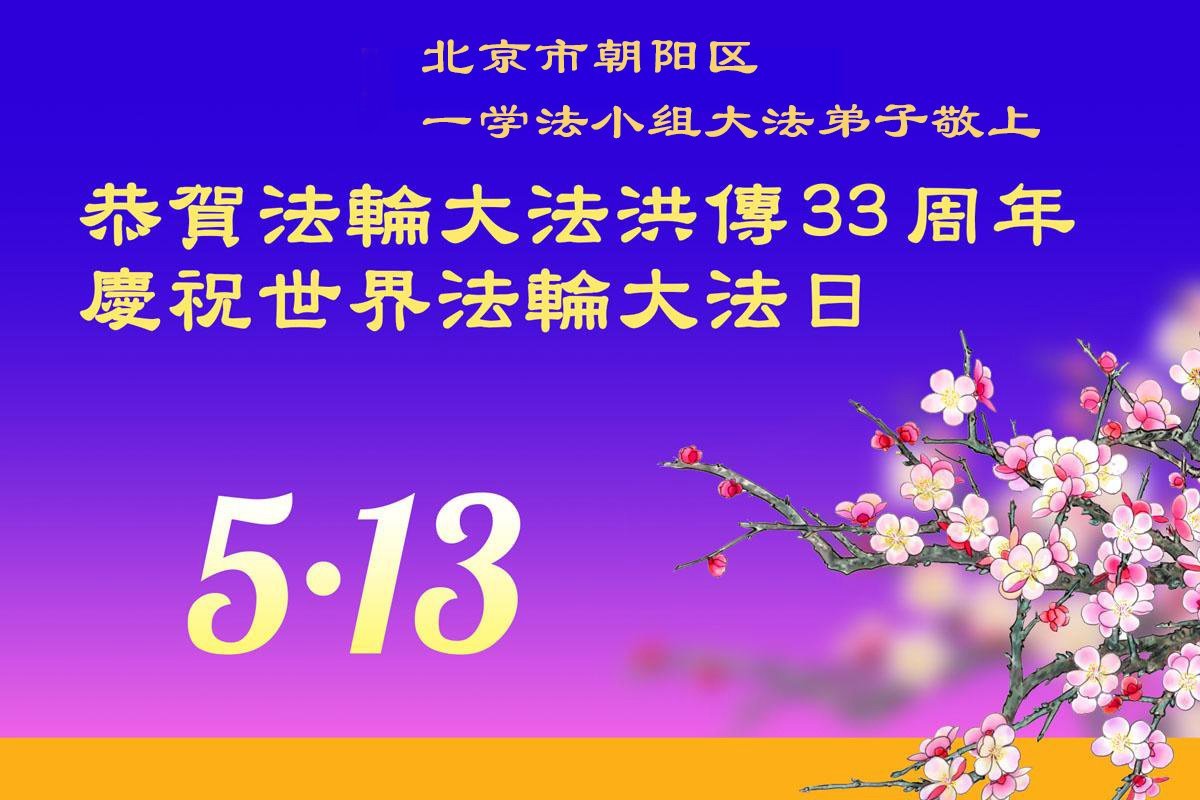 恭贺法轮大法洪传33周年,恭贺世界法轮大法日! 真修弟子做好三件事,勇猛精進,跟师父回家。 北京市密云区一学法小组大法弟子敬上 北京市海淀区一学法小组大法弟子恭贺5.13世界法轮大法日暨师父华诞!