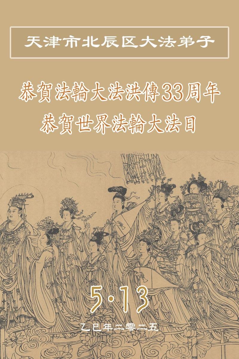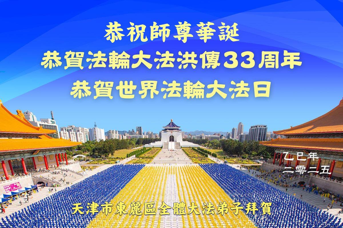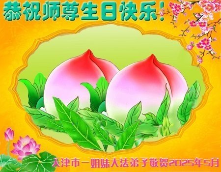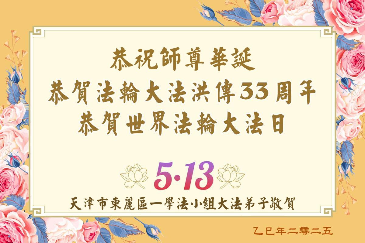 普天同庆、同贺5.13世界法轮大法日! 恭贺法轮大法洪传33周年! 恭祝慈悲伟大的师父生日快乐! 天津市东丽区一学法小组大法弟子敬上 2025年4月18日 天津市东丽区大法弟子恭贺513世界法轮大法日暨师父生日快乐!
