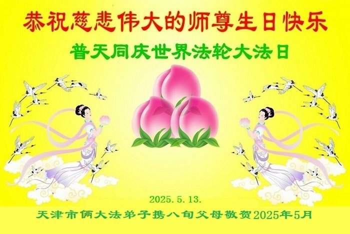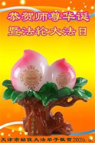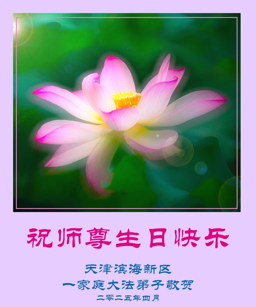 普天同庆、同贺513世界法轮大法日! 恭贺法轮大法洪传33周年! 恭祝慈悲伟大的师父生日快乐! 愿师尊多一份欣慰,少一分辛劳。 天津市东丽区大法弟子叩拜 2025年4月18日 天津滨海新区一家庭大法弟子恭贺世界法轮大法日暨师尊生日快乐!