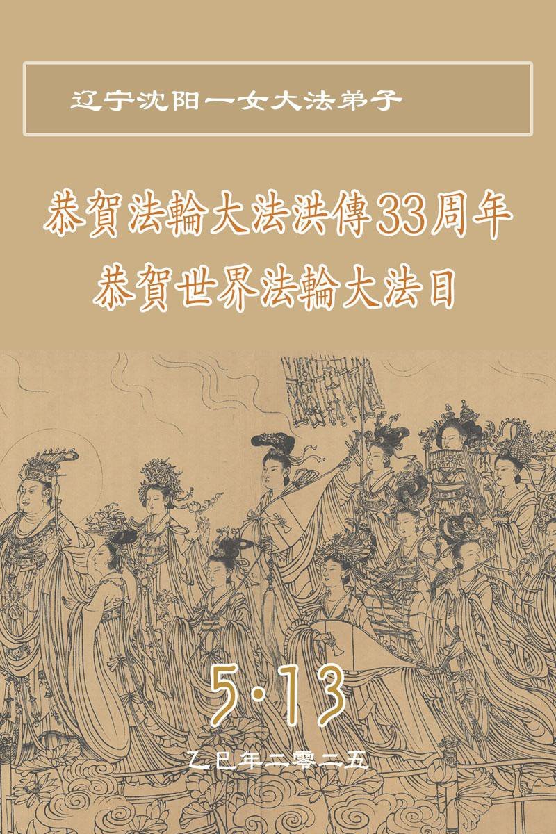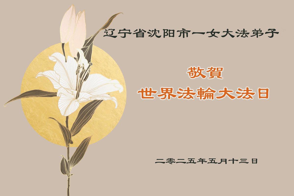 【明慧网二零二五年五月九日】 辽宁省沈阳市一女大法弟子恭贺世界法轮大法日暨敬祝师尊生日快乐!