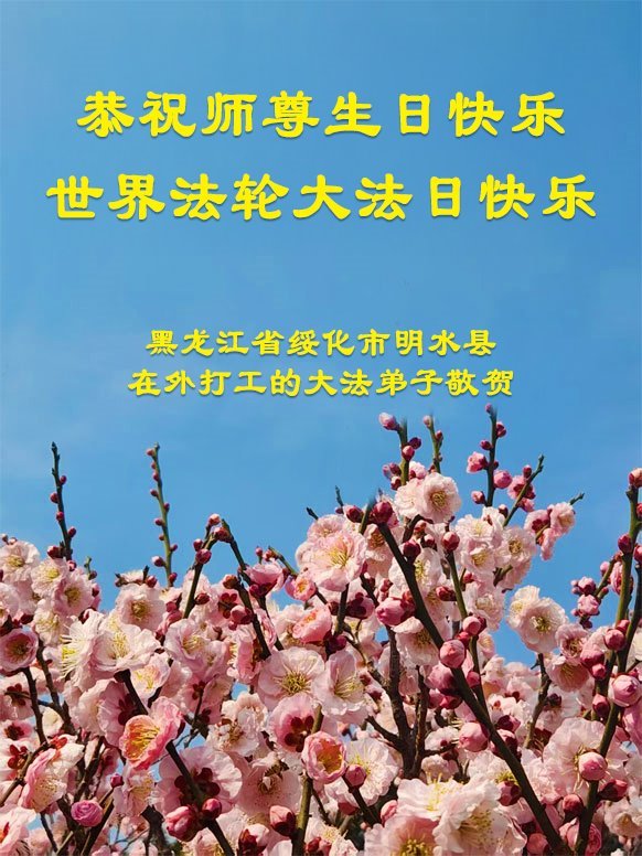 恭贺世界法轮大法日!恭祝师尊生日快乐! 黑龙江省绥化市明水县在外打工的大法弟子敬上 黑龙江省伊春市翠峦区全体大法弟子恭贺世界法轮大法日暨师父华诞!
