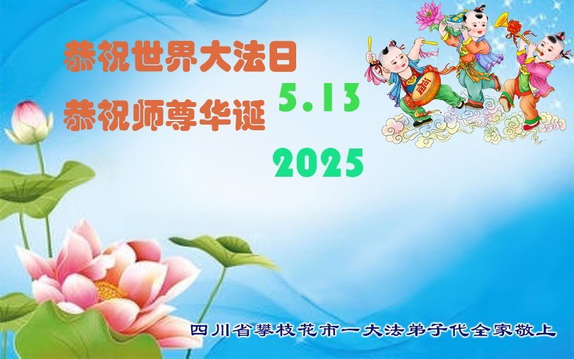 恭贺5.13世界法轮大法日! 恭祝师尊华诞 !世界需要真善忍! 四川省绵阳一大法弟子及家人敬上 2025年4月26日 四川省绵阳市一大法弟子恭贺世界法轮大法日暨敬祝师尊生日快乐!