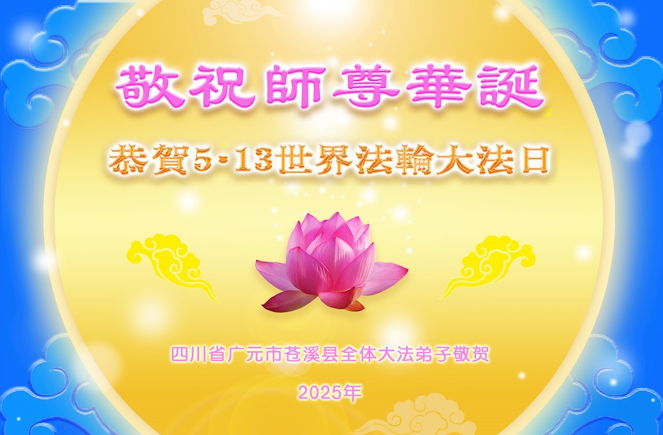 恭贺5·13世界法轮大法日! 恭祝慈悲伟大的师尊生日快乐!师尊您辛苦了! 天净沙·大法恩泽万方 大法恩泽万方,天地繁荣永昌。 众生感恩圣王,洪宇永载辉煌! 四川省自贡市全体大法弟子敬上 2025年5月4日 四川省广元市苍溪县大法弟子恭贺世界法轮大法日暨慈悲伟大的师尊生日快乐!