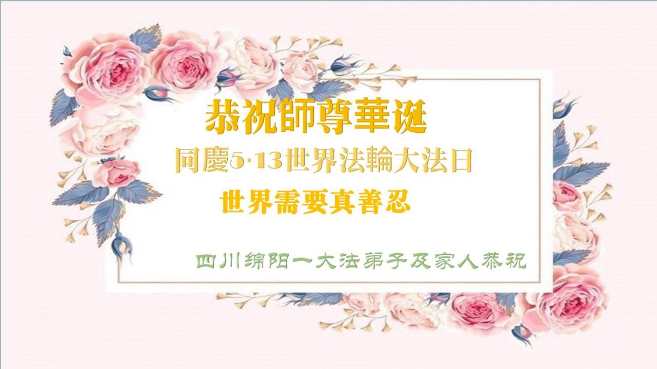 恭贺5·13世界法轮大法日!恭祝慈悲伟大的师尊生日快乐! 师尊您辛苦了!感谢师尊慈悲救度,师恩浩荡! 五月亿莲开,感恩圣王栽。救众登法船,随师回天外。 四川省广元市苍溪县大法弟子敬上 四川省绵阳一大法弟子敬贺世界法轮大法日暨师尊华诞!
