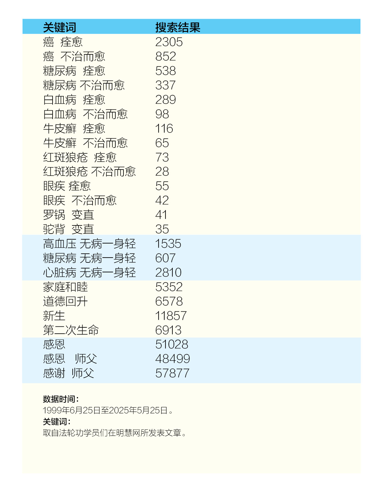 | 【明慧网二零二五年六月三日】二零二五年五月十三日,是法轮大法传世三十三周年纪念日,也是第二十六个“世界法轮大法日”暨法轮大法创始人李洪志大师华诞。数以万计的贺卡、贺信,从世界各地寄往明慧网。 自一九九二年五月十三日,法轮大法从长春开传以来,已弘传世界一百多个国家和地区,主要著作《转法轮》翻译为五十余种语言。法轮大法跨越国界,口传口,心传心,使不同肤色、不同族裔的上亿人走上返本归真之路,修炼者的身心得以净化,与人为善,道德升华。 从明慧网数字看法轮功袪病健身效果 明慧网记录了一部分修炼者身心的变化,我们以明慧网的搜索功能做了简要的统计,对于在常人难以医治的顽疾、绝症,在修炼之后出现的变化,予以概要的观察,部分案例有个别重复,但不影响整体数据的准确性。 搜索到的文章的数量体现了学员修炼收益的一小部分,以及感恩之心。但因为文章作者们使用的关键词各异、数量众多,比如一年一度的世界法轮大法日、西历新年、中国新年、中秋节这四个主要节日,每次都有数以万计的贺卡贺词通过明慧网寄给李洪志师父,表达感恩和思念,所以本文所用的简单搜索方式和有限的几个关键词,属于挂一漏万,只能是概念性的为大家呈现全局的一个小小局部。比如,从本文数字中,我们可以看到,因罹患癌症而开始学习法轮功的学员,比因其他病痛而开始学习法轮功的学员,人数多出许多。 明慧网搜索功能为“关键词”搜索,即只有包含所有关键词的内容,才会显示,这样可以保证内容本身与关键词的吻合,经实际枚举验证,吻合率基本上为全部合格。 本次查询仅以“疾病类型+痊愈、不治而愈”为关键词,其他如“疾病类型+治愈、不翼而飞、全好了、不见踪影”等均未收录。搜索的时间区间是1999年6月25日至2025年5月25日。 上图:本文用于搜索的关键词和搜索结果,一篇文章中出现该关键词则计为1,尽管该文中可能只包含一个案例,也可能包含多个案例。