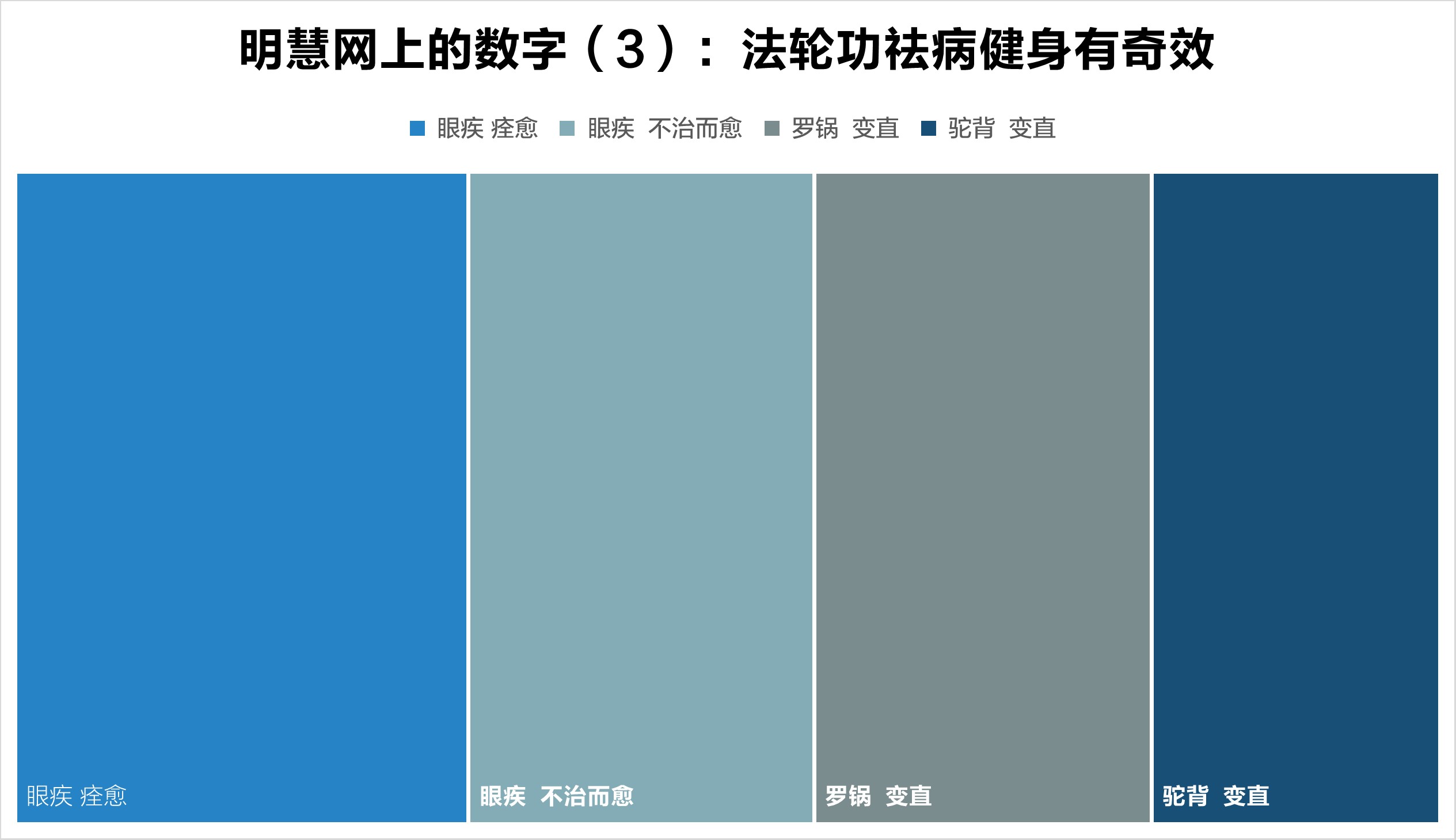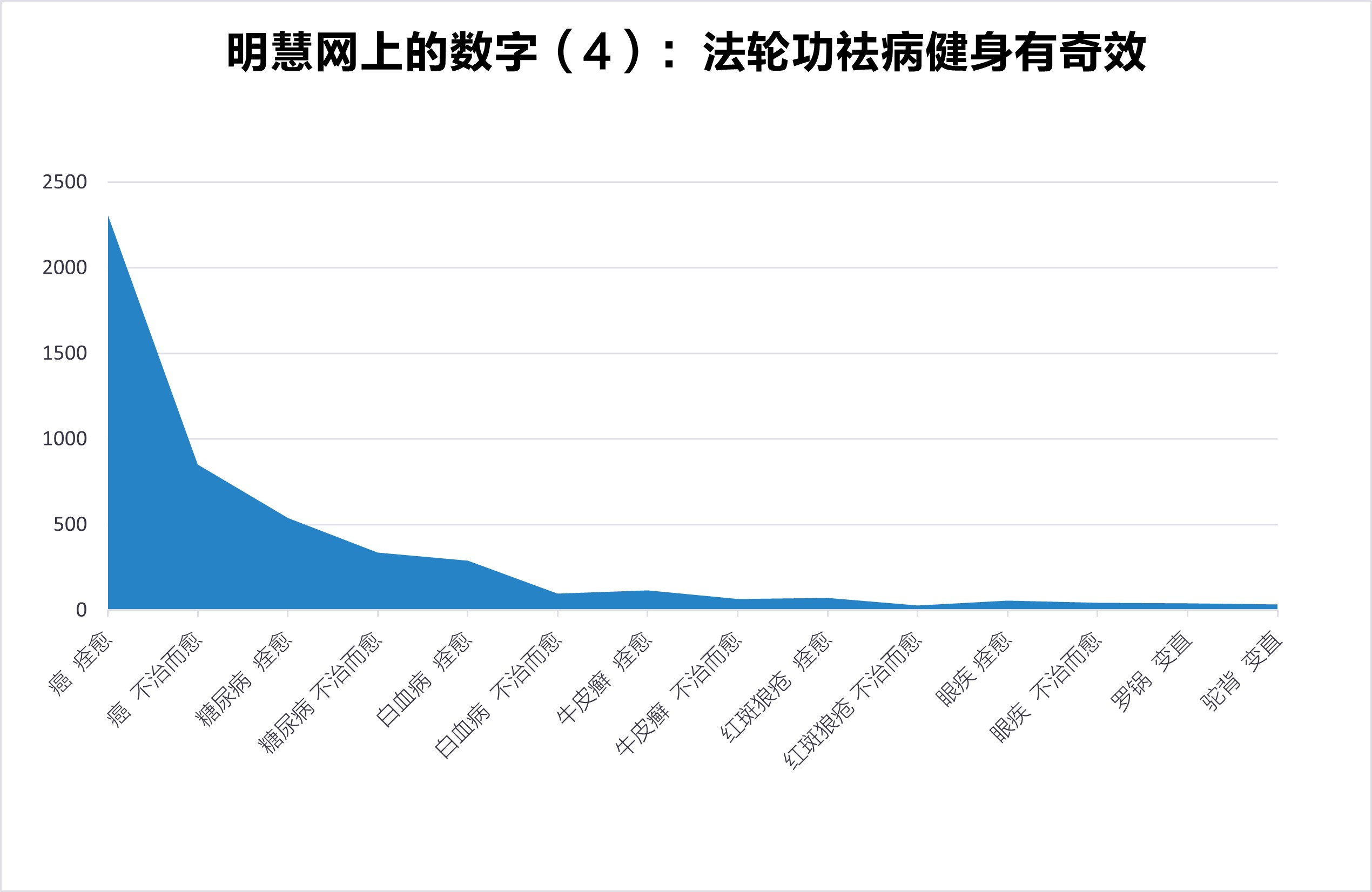 图4:包含癌症、糖尿病、白血病、牛皮癣、红斑狼疮、眼疾、罗锅、驼背的文章篇数。很多学员最初是因绝症、顽症医治无门而走进法轮功的。修炼后,在无求自得中,病痛神奇的治愈或不治而愈了。 |