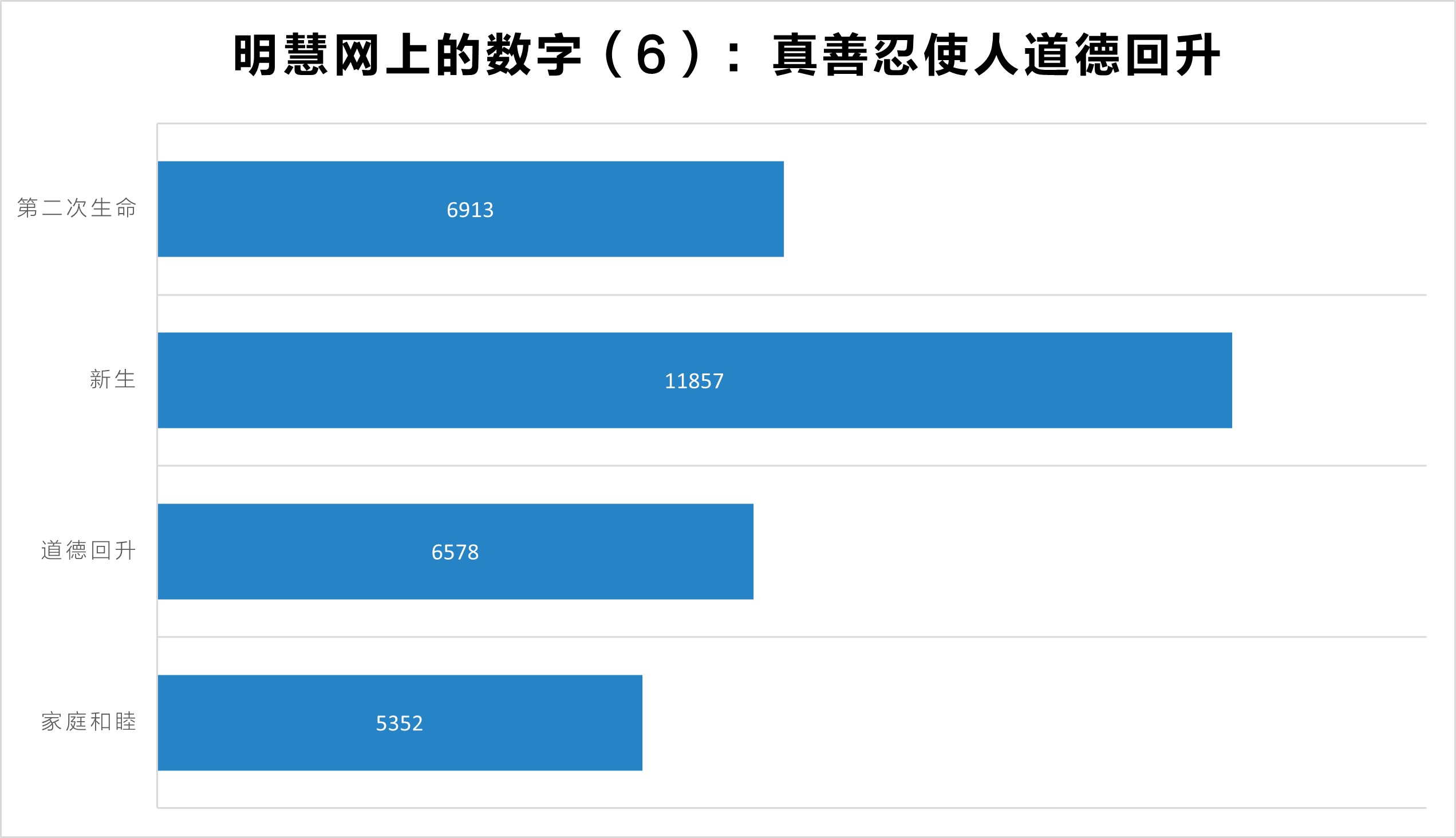 图6:因修炼法轮功而获得道德回升、家庭和睦,以及因学炼法轮功重获健康,而表达法轮功给了自己第二次生命、让自己获得新生的文章篇数。 |
