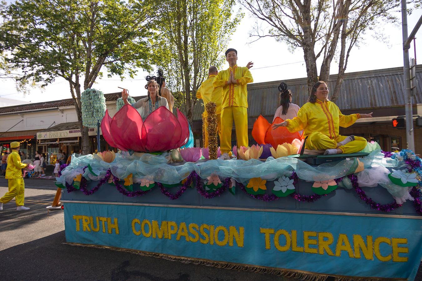 由于法轮功学员出色的创意和呈现,法轮功团体获得了主办方颁发的市长奖(Mayor's Award),主办方还表示希望法轮功团体明年再参加游行。 民众期盼 谢谢你们的美丽讯息 法轮功团体在游行中展现的花车被美丽的祥云和各色花朵精心点缀,多彩的莲花在祥云中升起,花车上有多名身着炼功服和仙女服的学员,他们有的在展示法轮功五套缓、慢、圆的功法;有的在向观众们挥手致意。  图4~6:法轮功团体在游行中展现的花车 |