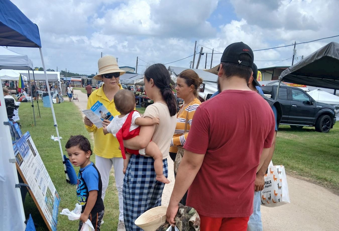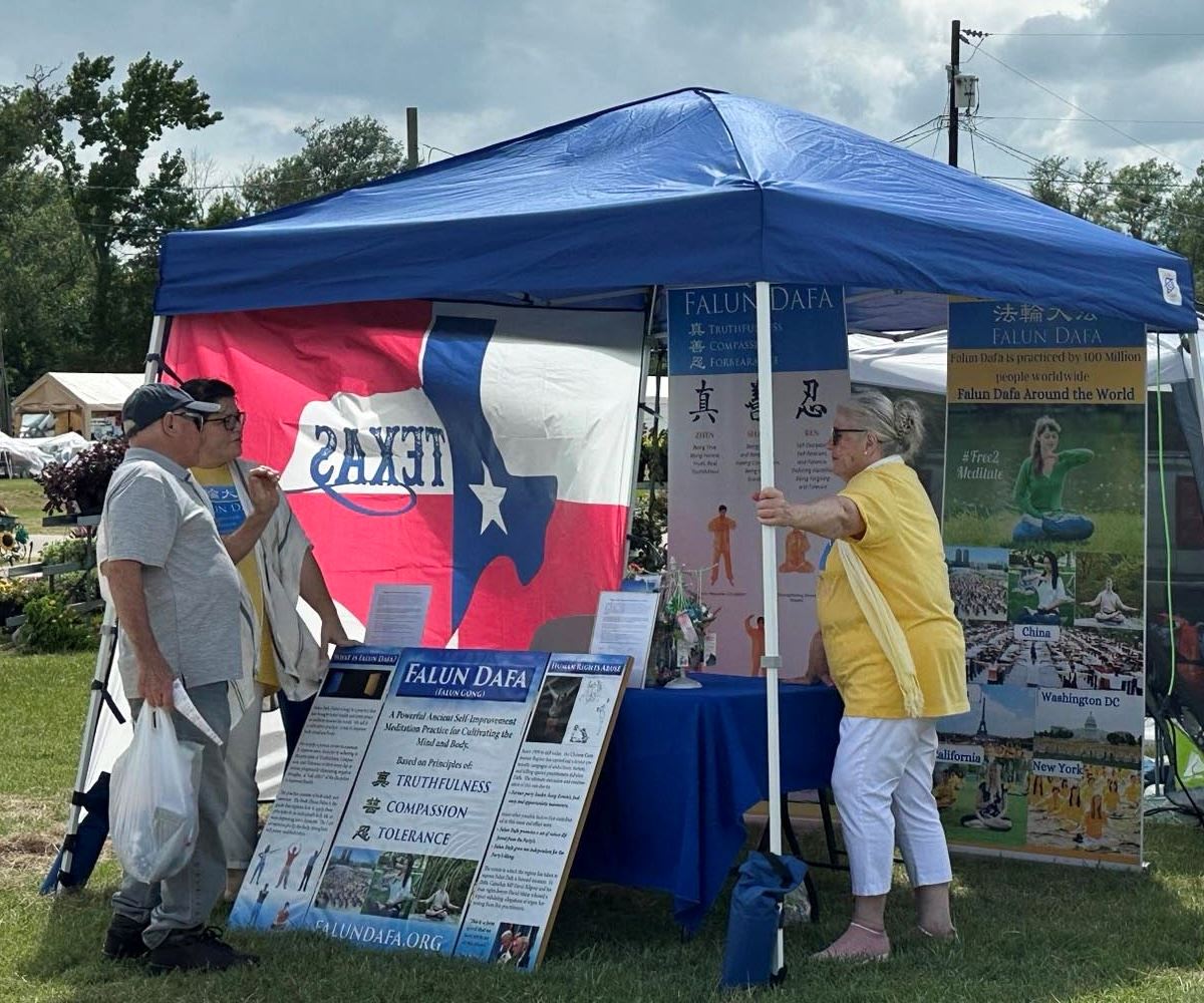 一位西班牙裔女士来到法轮功展位前拿法轮功传单。她说她丈夫是马来西亚华人,婆婆曾向她与丈夫介绍法轮功,最近夫妻正计划着学法轮功,今天就在这里碰到了法轮功,太高兴了! 凯(Kay)居住在路易斯安那州,这周应朋友之邀来德州游玩,国庆这天与四、五朋友来集市,在这里听到了法轮功的信息。与她一起听真相的黑人女孩对炼功非常感兴趣,拿走了当地炼功点及教功信息。 丹尼尔(Daniel)是一位八十岁的越战老兵,在德州炎热的华氏95°(摄氏35°)的天气下,其他同龄人需要借助代步车,而他却独自走路购物,精神矍铄。他说来到这个展位是因为他感受到这里有正的能量。他说他曾在亚洲旅行,学习过许多传统的养生方法,也深知这些方法确实有效。他对法轮大法非常感兴趣,同时对中共在中国迫害法轮功感到非常悲伤。他表示有兴趣阅读《转法轮》并在网上学习功法。  图4:越战老兵丹尼尔(左一)感受到法轮功展位有正的能量 |