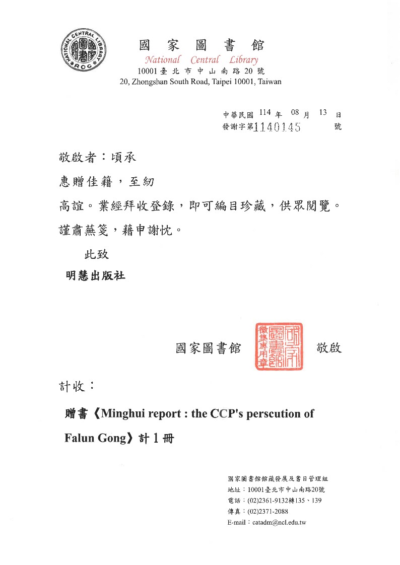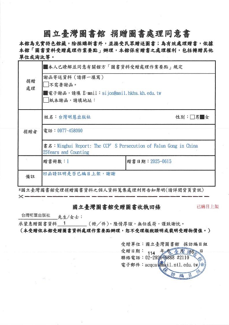 译文: 华盛顿大学 捐赠计划 2025年7月14日 天梯书店 28 Grand Ave Middleton, NY 10940 尊敬的先生/女士: 我谨代表华盛顿大学图书馆,对您于2025年6月13日的捐赠表示诚挚的谢意。我们诚挚地确认已收到由明慧团体提供的《法轮功受中共迫害二十五年》一书。 华盛顿大学成立于1861年,其奠基石是一群先驱者的捐赠,他们深知教育在塑造未来中的重要作用。如今,他们的乐观精神和对无限可能的信念,已在这所世界一流的公立大学及其图书馆中得以体现。您的慷慨延续了他们的宏伟愿景。在您的支持下,我们持续建设高质量的馆藏,以推动探索、改变人生,并创造一个更美好的世界。再次感谢您对华盛顿大学图书馆的支持。 此致, Alex H. Kim 礼品图书管理员 台湾国家图书馆的回执 明慧出版社您好: 感谢贵出版社赠书,该书本馆已经编目上架供读者调阅,随信谨呈赠书谢函一份,如附件,请查收,谢谢! 祝 业务顺利 周毅 Chou, Yih (Mr.) 国家图书馆 馆藏发展及书目管理组敬上 Collection Development and Bibliography Management Division National Central Library, Taiwan 国立台湾图书馆回执 台湾明慧出版社先生/女士: 承蒙惠赠图书资料Minghui Report:The CCP’S Persecution of Falun Gong in China 25Years and Counting(一册),隆情厚谊,无任感荷,谨致谢忱。请查收。 另,下列网址为本馆已编目入藏之连结,请查阅,谢谢您! https://cis.ntl.edu.tw/F/LHKSXGNH7Q6381HF2GQ18NY843TJT4UEHRMKB5YCEBP53P6KNK-04461?func=short-0&set_number=001022 敬祈 平安顺心 卢姵谕敬上 国立台湾图书馆采访编目组