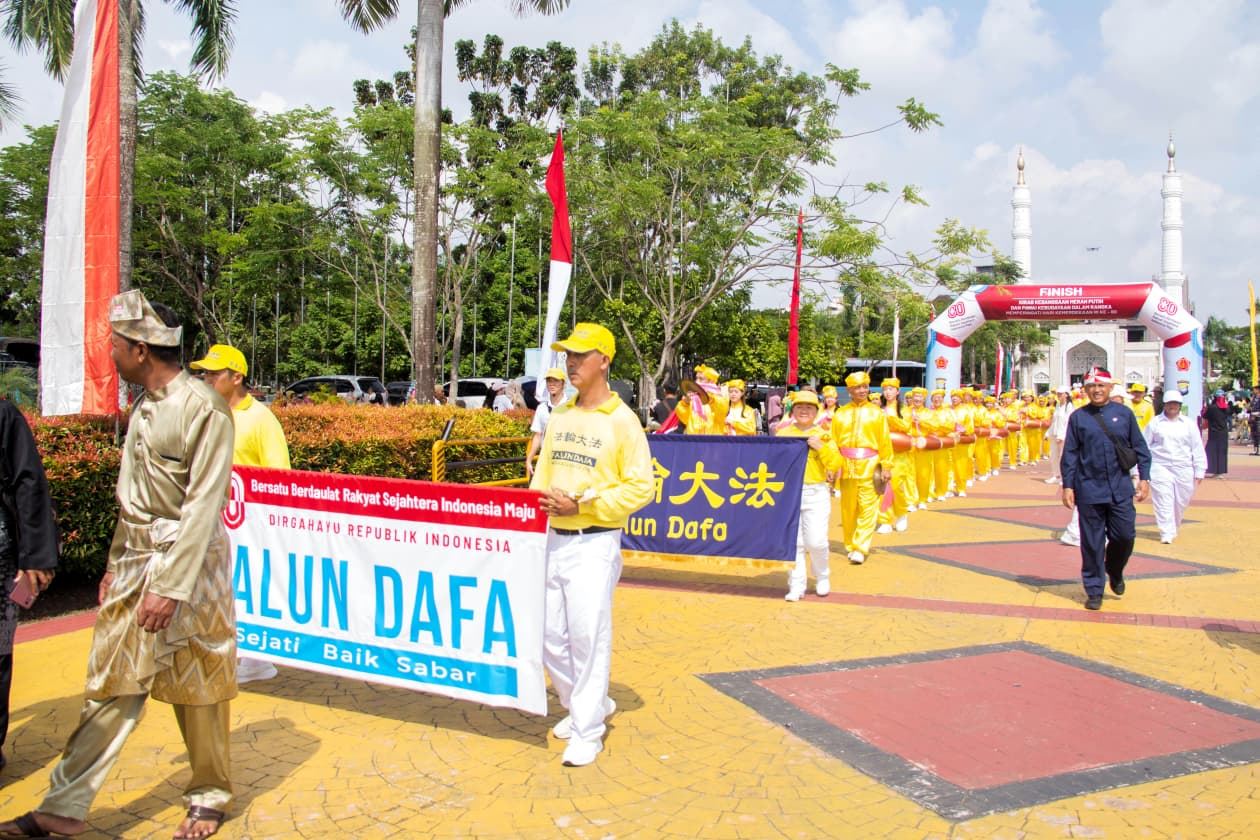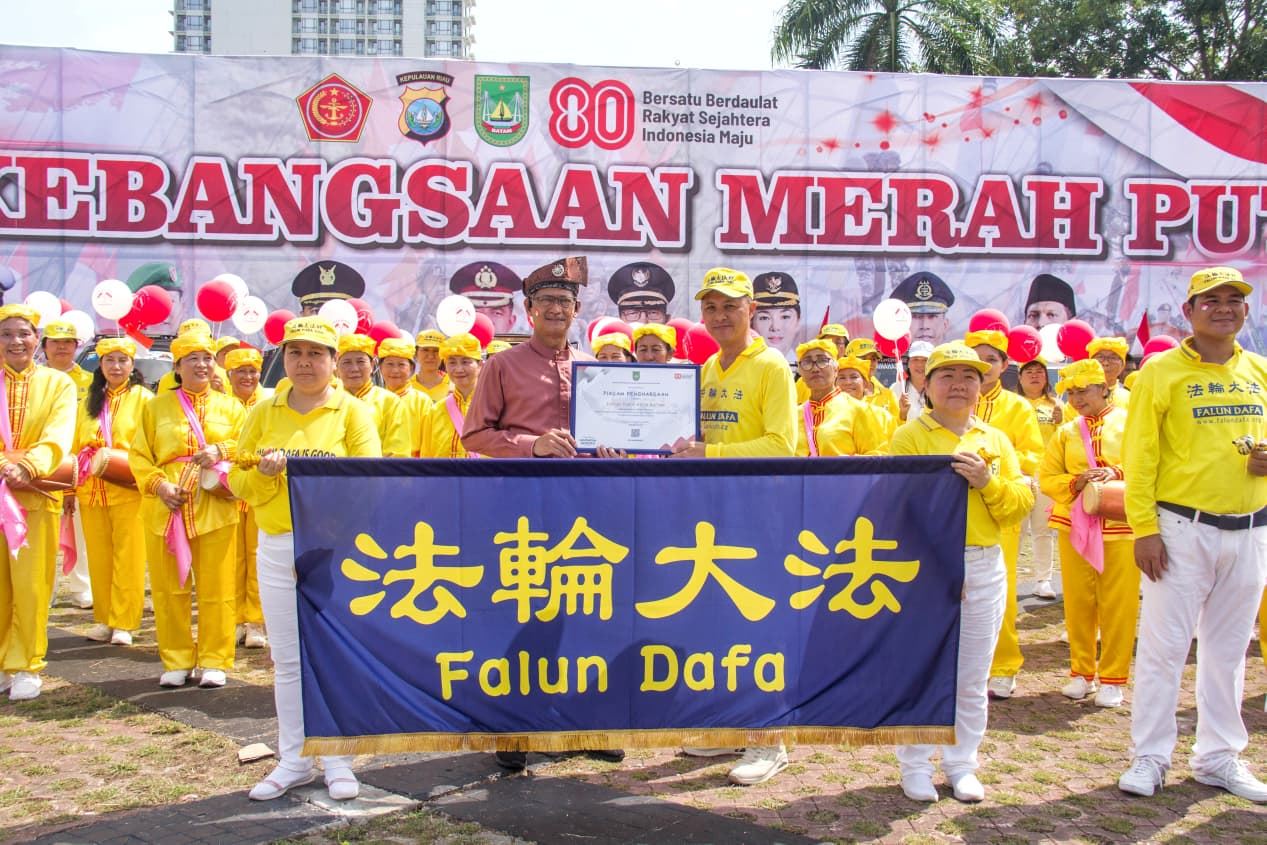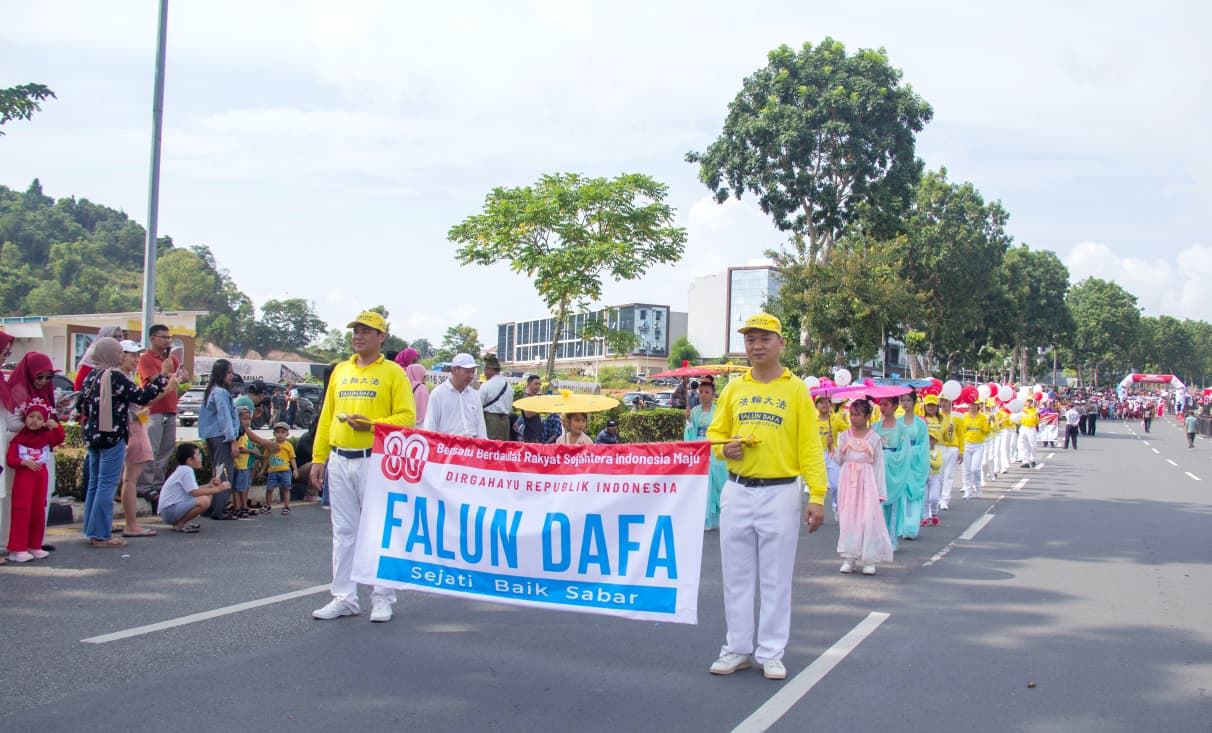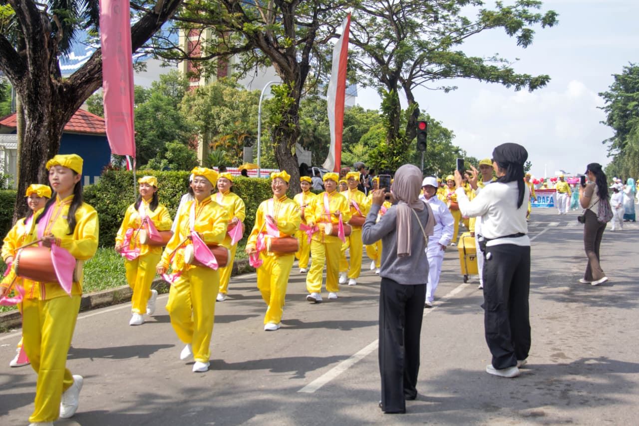 | 【明慧网二零二五年八月十五日】为庆祝印尼独立八十周年,巴淡岛(Batam)市政府于二零二五年八月十日在市中心举行了盛大的游行庆祝活动,法轮功团体受邀参加,赢得主办方和各行业民众的欢迎和赞扬。 据游行组委会估计,当天参加和观看此次游行的民众约八千人现场观看了游行活动。早上八点半,巴淡市长阿姆萨卡·阿赫迈德(Amsakar Achmad)和副市长李·克劳迪娅·钱德拉(Li Claudia Chandra)为游行开幕,来自地方政府机构、军事单位和各个社区团体依次行进。法轮功的队伍由腰鼓队打头阵,随后是身着传统东方服饰和手持红白气球及印尼国旗的学员们,他们的音乐祥和悦耳,队形整齐有序,赢得观众的阵阵掌声,许多人拿起相机记录下这珍贵的一幕。  图1~6:来自印尼、新加坡、马来西亚和台湾等地的法轮功学员参加了二零二五年巴淡岛独立日游行。 |