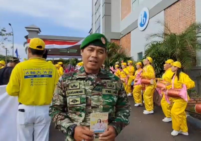 各行业民众赞颂法轮大法 参加当天活动的法轮功学员不仅来自印尼巴淡岛本地,还有的从新加坡、马来西亚和台湾等地赶来,他们向观众分发传单,介绍大法的美好,市民踊跃了解真相。 来自印尼军队的亚历山大(Alexsander)中士负责维护本次游行的安全,他表示:“看到法轮功学员从邻国如马来西亚等地赶来,我感到非常骄傲。(我欢迎)法轮大法和真善忍。自由!” “自由”一词是印尼独立日庆祝活动中的常见用语,表达了人们希望国家和民族自由、免受压迫的愿望。  图8:亚历山大中士看到法轮功学员从国外赶来印尼参加游行,这让他倍感骄傲。 |