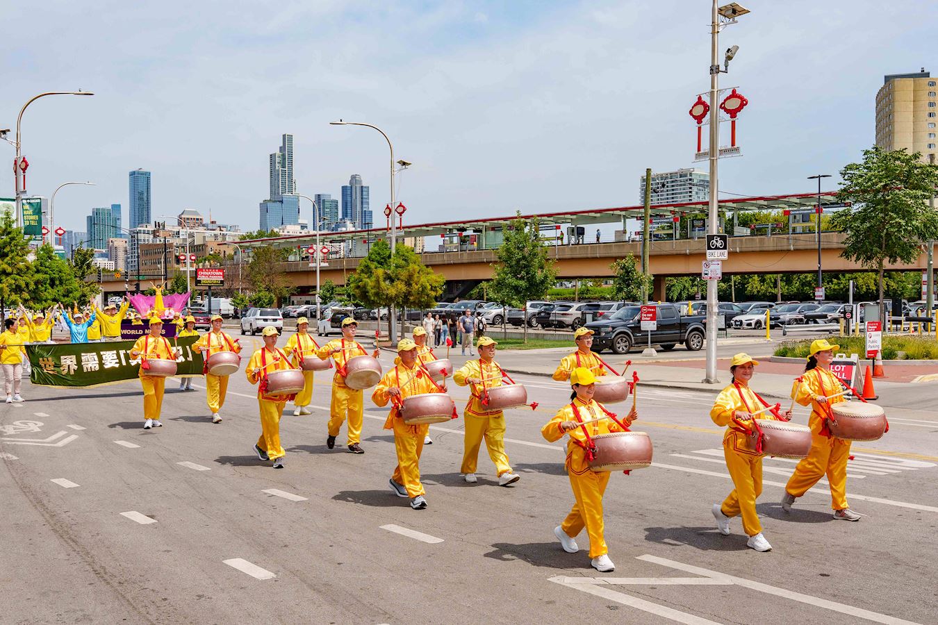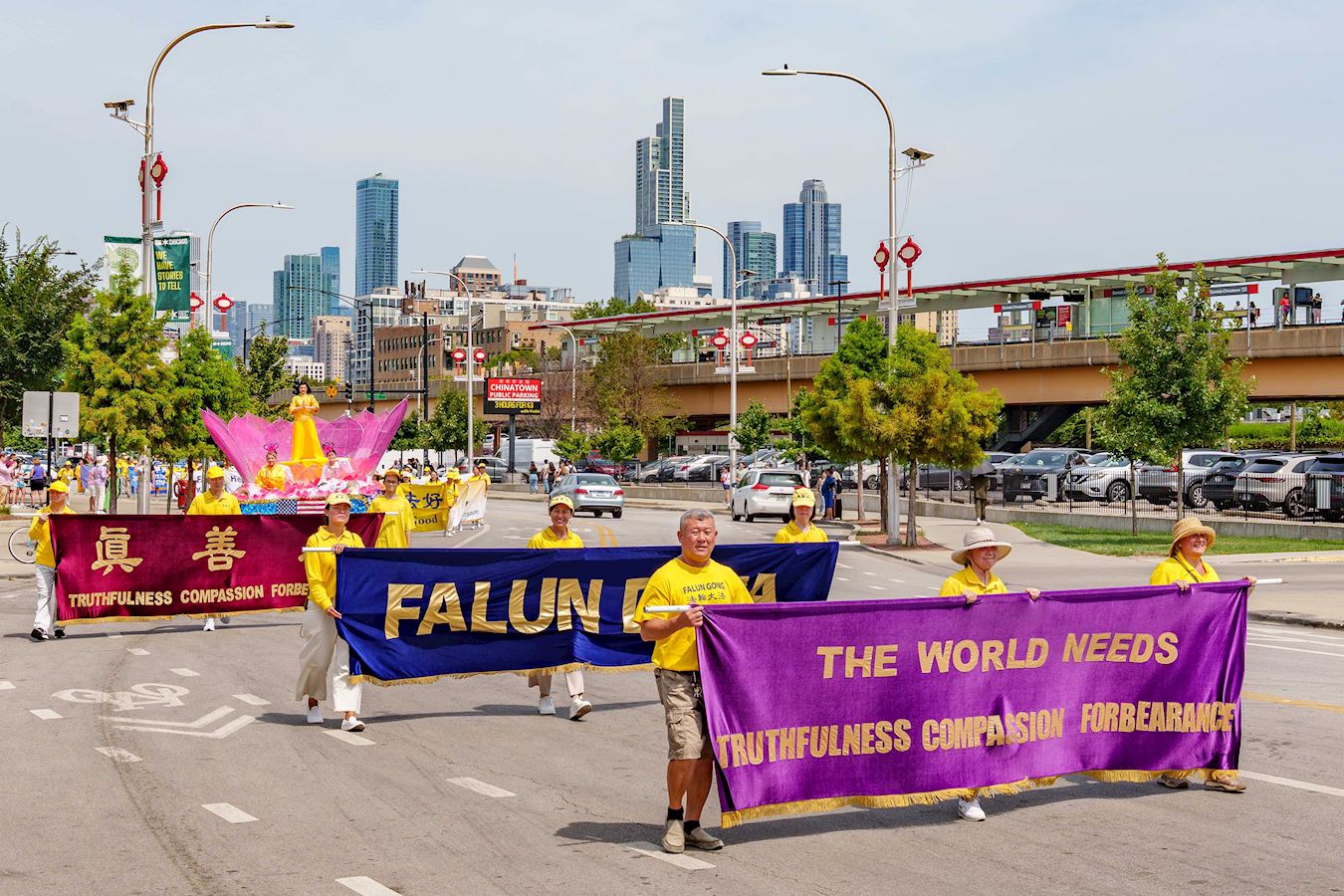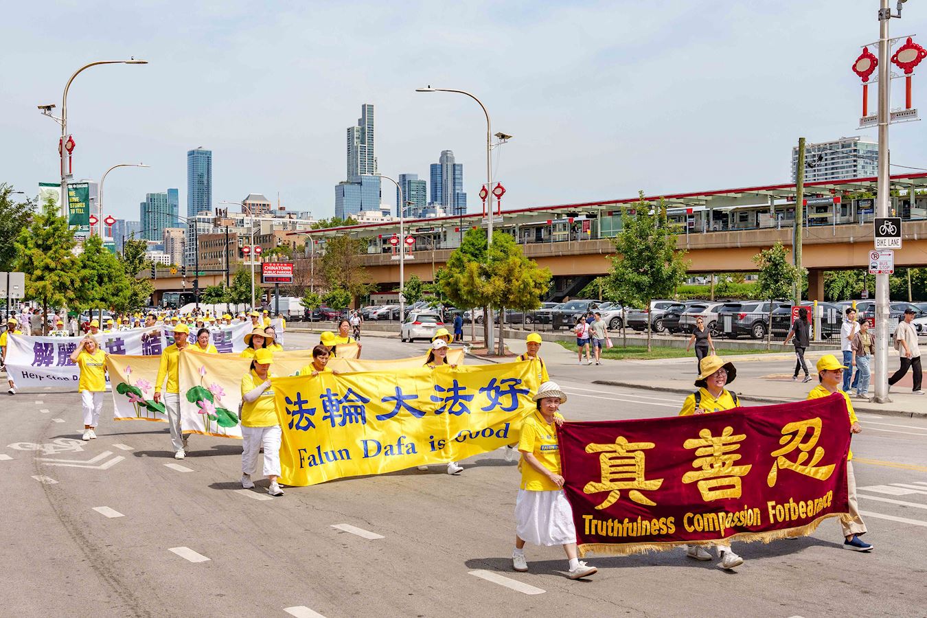 | 【明慧网二零二五年八月十九日】二零二五年八月十六日,美国中部十多个州的法轮功学员在芝加哥中国城举行盛大游行。他们通过游行展示法轮大法的美好,同时呼吁人们关注真相,共同反对并制止中共对法轮功的跨国迫害。沿途得到了众多当地游客和居民的热情支持与鼓励。 正值八月旅游旺季,作为全美第三大城市的芝加哥也迎来了非常多的游客。法轮功大游行从中国城的标志性景点——中山公园出发,以“法轮大法好”和“真、善、忍”的横幅和旌旗方阵开道,随后是铿锵有力的唐鼓方阵和美丽的花车,紧接着的是优美祥和的炼功方阵,以及身着白衣的致敬被中共迫害致死的法轮功学员的悼念方阵、停止迫害法轮功为主题的方阵。  图1~7:二零二五年八月十六日,美中十多个州的部分法轮功学员在芝加哥中国城举行大游行,展示法轮大法的美好,同时呼吁人们制止中共对法轮功的跨国迫害。 |