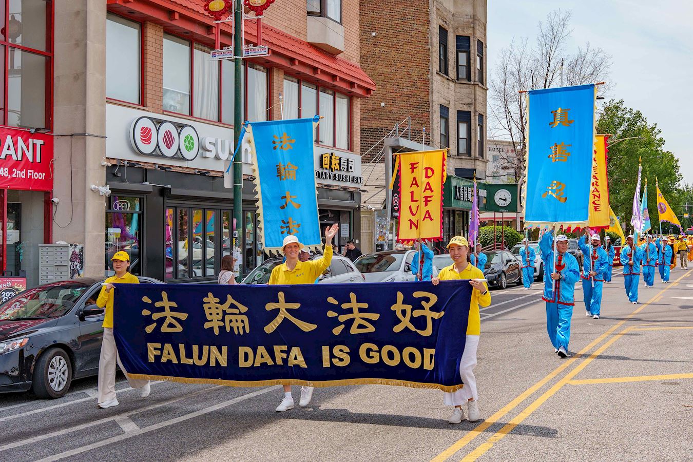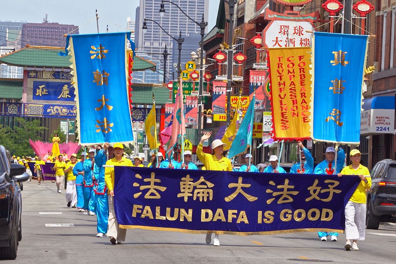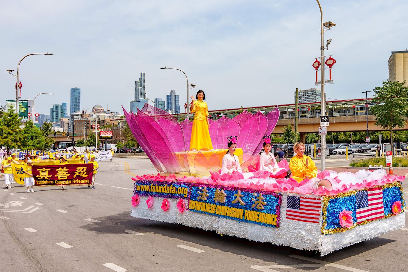 | 【明慧网二零二五年八月十九日】二零二五年八月十六日,美国中部十多个州的法轮功学员在芝加哥中国城举行盛大游行。他们通过游行展示法轮大法的美好,同时呼吁人们关注真相,共同反对并制止中共对法轮功的跨国迫害。沿途得到了众多当地游客和居民的热情支持与鼓励。 正值八月旅游旺季,作为全美第三大城市的芝加哥也迎来了非常多的游客。法轮功大游行从中国城的标志性景点——中山公园出发,以“法轮大法好”和“真、善、忍”的横幅和旌旗方阵开道,随后是铿锵有力的唐鼓方阵和美丽的花车,紧接着的是优美祥和的炼功方阵,以及身着白衣的致敬被中共迫害致死的法轮功学员的悼念方阵、停止迫害法轮功为主题的方阵。  图1~7:二零二五年八月十六日,美中十多个州的部分法轮功学员在芝加哥中国城举行大游行,展示法轮大法的美好,同时呼吁人们制止中共对法轮功的跨国迫害。 |