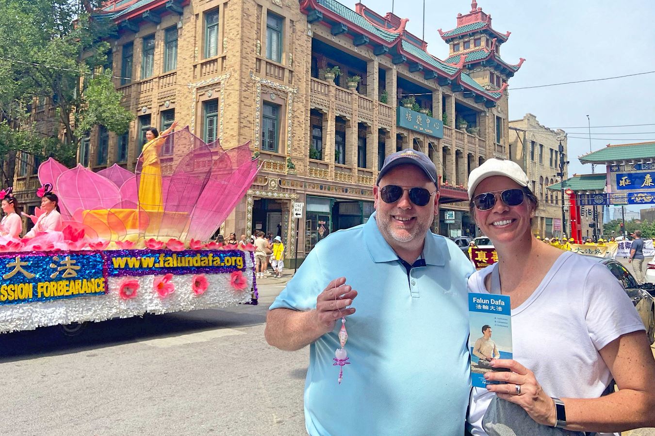 吉姆·蒙迪和冯达·蒙迪(Jim & Vonda Monday)在中国城观看了法轮功大游行。冯达说:“游行太精彩了。真、善、忍很美好,值得学习!”  图12:基普·巴恩斯和他的妻子想更多地了解法轮大法。 |