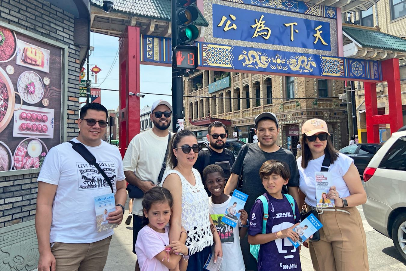 布莱恩·莱玛(Brian Lema),他的女友琼·巴拉皮(Joan Barapi)以及布莱恩的妈妈一起来中国城游玩,他们都非常喜欢这场游行。布莱恩表示,今天能了解到法轮大法很幸运,并感谢法轮功学员们与他们分享有关法轮大法的信息。  图14:金妮·洛佩兹(前排左二)和她的全家都支持法轮功反迫害。 |