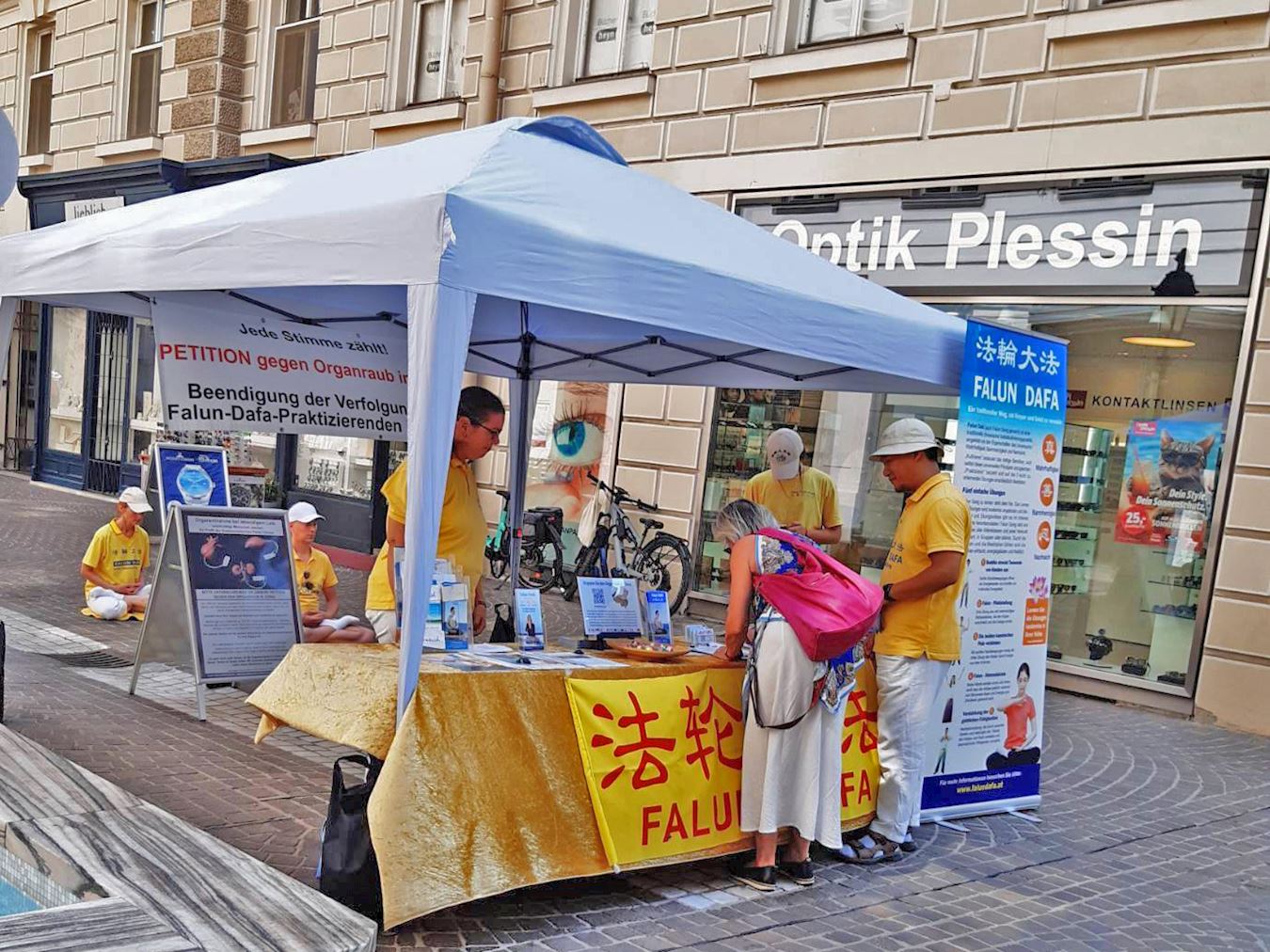 | 【明慧网二零二五年八月二十日】二零二五年八月十六日,奥地利部分法轮大法学员在奥地利卡林西亚州首府克拉根福(Klagenfurt)举办了信息日活动。卡林西亚州是奥地利最南端的州,与斯洛文尼亚和意大利接壤。来自奥地利各地的学员汇聚于此,向民众传递大法福音,讲述法轮功反迫害的真相。不断有市民和游客在展位前驻足了解,纷纷在请愿书上签名声援反迫害。 法轮大法真相展位设立在当地著名的“沃尔特湖之神”(Wörtherseemandl)纪念碑旁。沃尔特湖之神是卡林西亚州的一位神话人物,相传是他创造了沃尔特湖。该纪念碑是游客团、带孩子的度假家庭和当地居民在步行区的热门目的地。旁边的法轮大法真相展位为人们了解法轮大法的美好,以及二十六年来大法修炼者和平理性揭露中共非法迫害,提供了绝佳机会。  图1~3:二零二五年八月十六日,部分奥地利法轮功学员在著名景点克拉根福设立真相展位,展示功法,征集请愿书的签名。不断有市民和游客在展位前驻足了解真相。 |