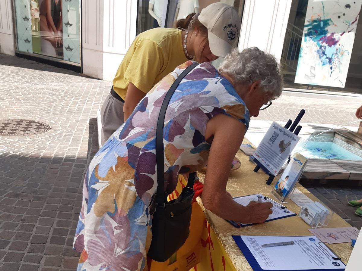 民众了解真相后由衷感谢学员传播这些信息 一位导游向她来自罗马的游客团翻译了真相横幅上的内容。随后,几位来自罗马的女性游客在呼吁停止迫害的请愿书上签了名。这位导游从展位上拿了很多真相传单,她希望尽自己所能呼吁停止在中国进行器官活摘。 一对夫妇在听到学员讲述活摘器官真相时,其丈夫态度明显变得强烈起来,称他不相信中国存在政府参与组织与支持的活摘器官行为。学员不懈地耐心向他讲解了英国的 “中国独立法庭”的情况:该法庭是杰弗里·尼斯爵士(Sir Geoffrey Nice KC)主导的,他是曾在前南斯拉夫国际刑事法庭审理斯洛博丹·米洛舍维奇案件的首席法官,该法庭得出的结论是,“在中华人民共和国长期的活摘器官实践中,法轮功学员确实是器官来源之一,并极有可能是主要来源。” 当听到尼斯爵士的名字和法庭判决结果后,这位先生改变了态度,他和妻子对学员们传播这些信息表示由衷的感谢,并高兴地接受了真相资料。 一位西人年轻男子仔细阅读了介绍法轮大法五套功法的展板内容。随后他询问这里是否是在为制止器官活摘而进行打坐。当他得知在中国,炼习这五套功法的学员会被拘禁并被活摘器官时,感到非常震惊。 一位女士在多年前听过一次法轮大法创始人李洪志先生的讲法后,几年来一直断断续续地炼习五套功法。再次看到法轮大法信息展台,令她眼前一亮。她抓住机会,再一次深入了解法轮功,并与一位学员进行了长时间的交谈。 收到小莲花作为礼物的小朋友们对这份美丽的惊喜感到非常高兴。莲花出淤泥而不染的品质令他们耳目一新。他们欣然接受卡片上写的“真善忍”的做人处事标准,他们的父母也非常认同这样的理念,并满怀喜悦地对学员表示感谢。 一位95岁的老太太,坐着轮椅经过信息点,她立即接过学员递上的传单,并了解了法轮大法真相。 她说:“我相信这是一件好事。”