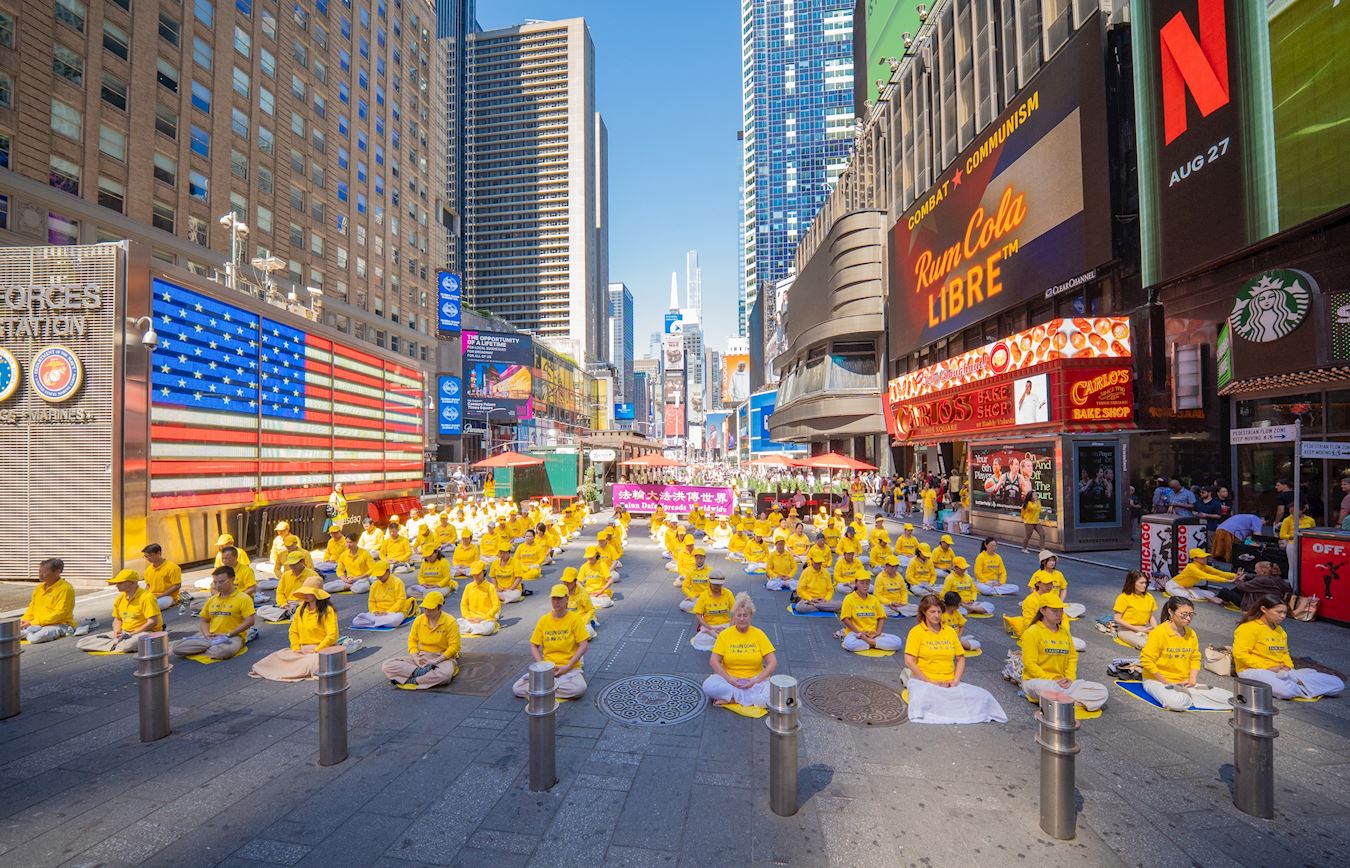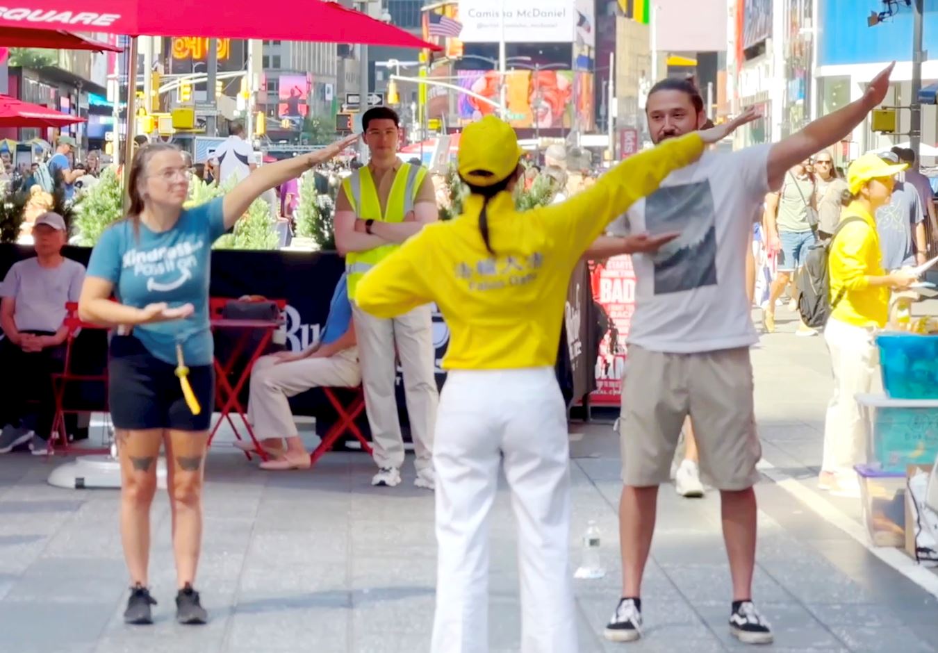 【明慧网二零二五年八月二十八日】二零二五年八月二十三日(周六)下午一点,被誉为“世界十字路口”的纽约时代广场,迎来一道特别的风景线,来自纽约和新泽西的部分法轮功学员在这里集体炼功,弘扬真善忍的美好。 图1~3:八月二十三日,部份纽约和新泽西法轮功学员在时代广场举行了集体大炼功活动。 |
