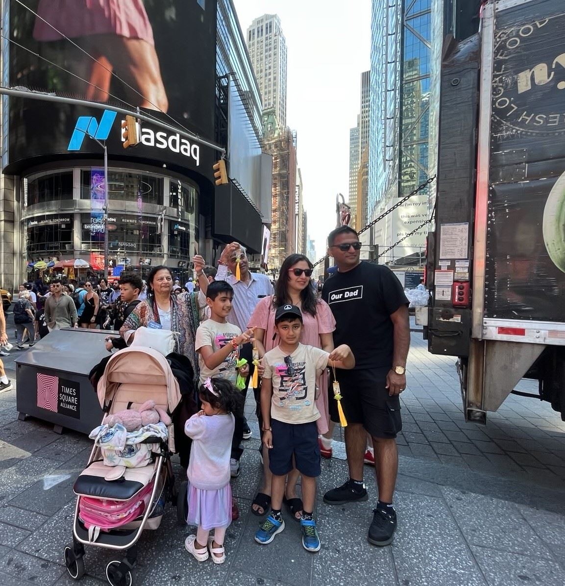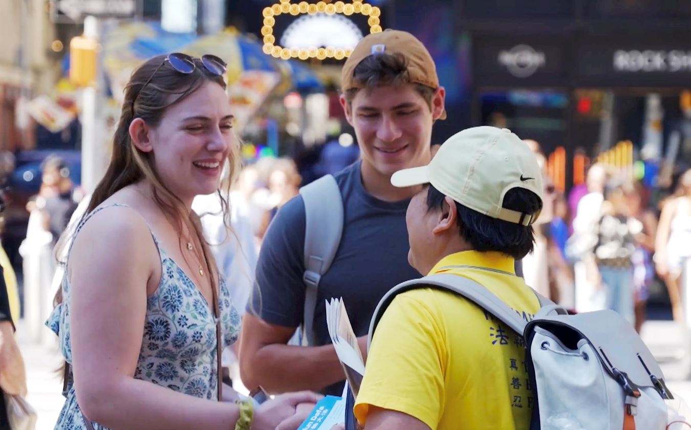 繁华喧闹的时代广场上,悠扬的炼功声中,法轮功学员穿着黄色T恤整齐排开,静静地炼着法轮大法的五套功法。这份难得的祥和与宁静吸引了众多路人驻足观看,不少人拿着手机拍照录影,还有人接过传单阅读,并有人当场学功。人们赞同真、善、忍的价值观,认为这正是全世界需要的。 游客称赞真善忍美好 来自印度的甘地(Gandhi)一家接过传单和真相小莲花表示,法轮功修炼者展示的功法在向世人传递这样的讯息:“那就是关于谦卑与对人类的慈悲。”  图5:甘地一家人表示,法轮功在向世人传递谦卑及对人类的慈悲。 |