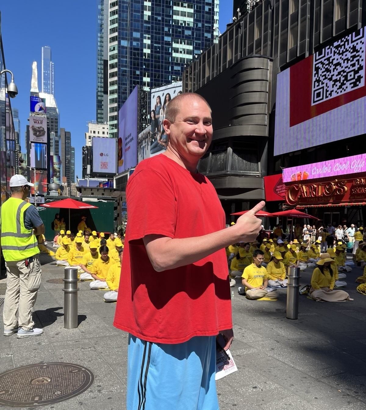 来自德州现场学功的游客说:“太好了,大家聚在一起。(学炼第一套)感觉很好、让人放松。” 来自意大利的游客很赞同:“我们所处的时代,需要有更多善良。你们所做的很有意思,传递提升心灵的信息。” 一位来自波多黎各的游客马克(Mark)分享了他对法轮功的印象。他表示,整体感觉非常美好,功法能够改善人的精神状态与身体健康。  图8:来自波多黎各的游客马克 |