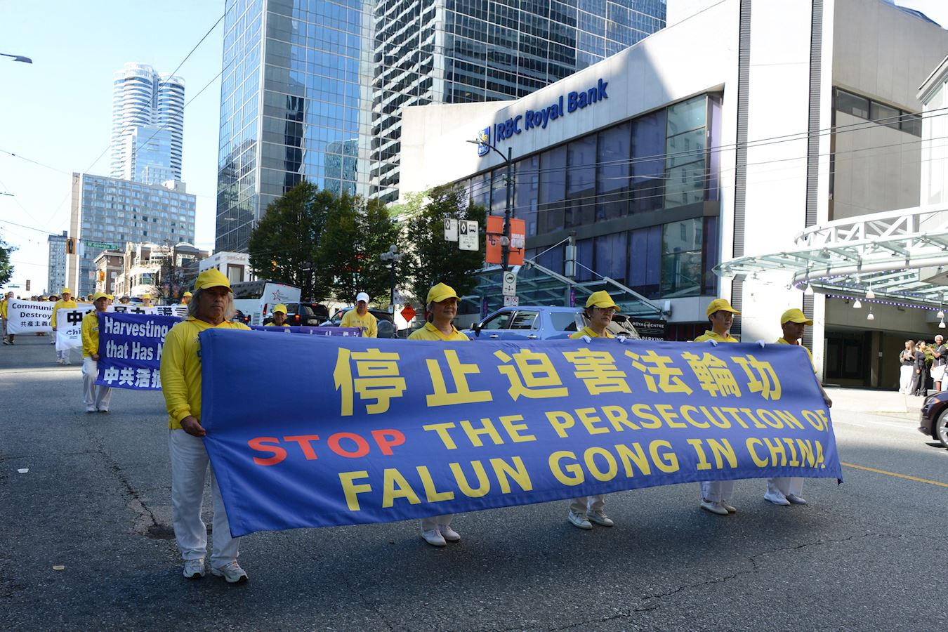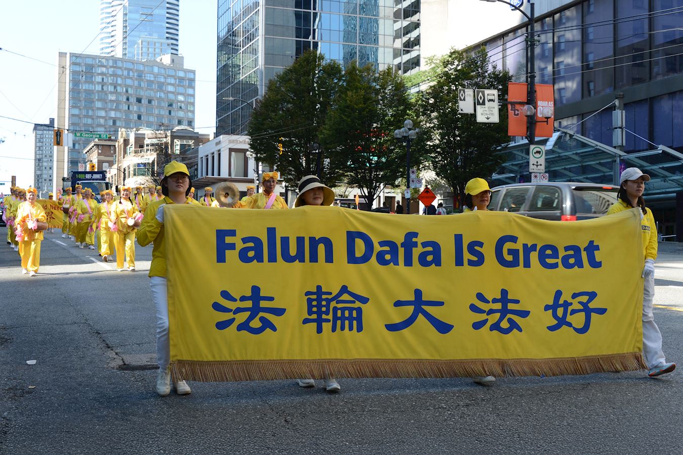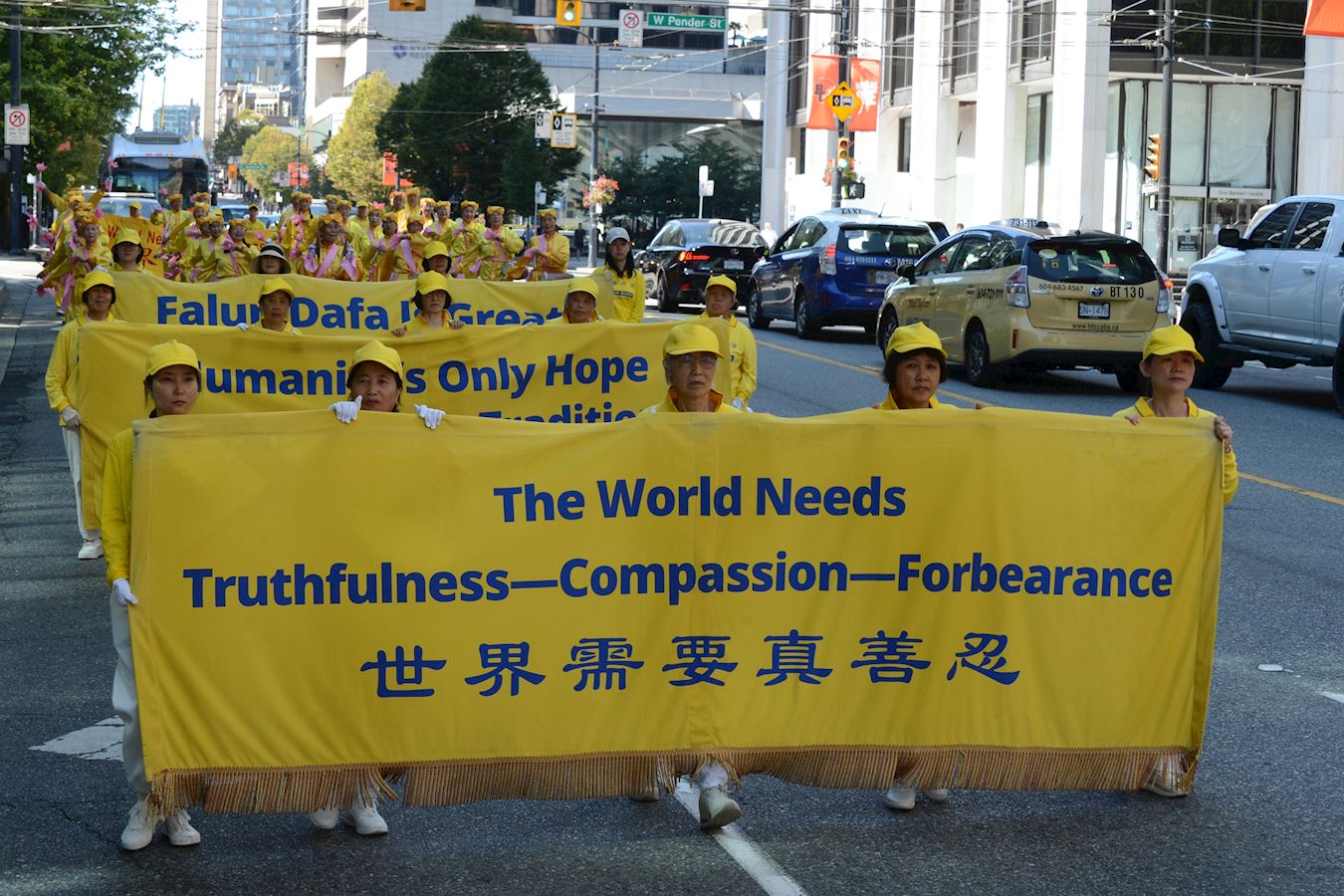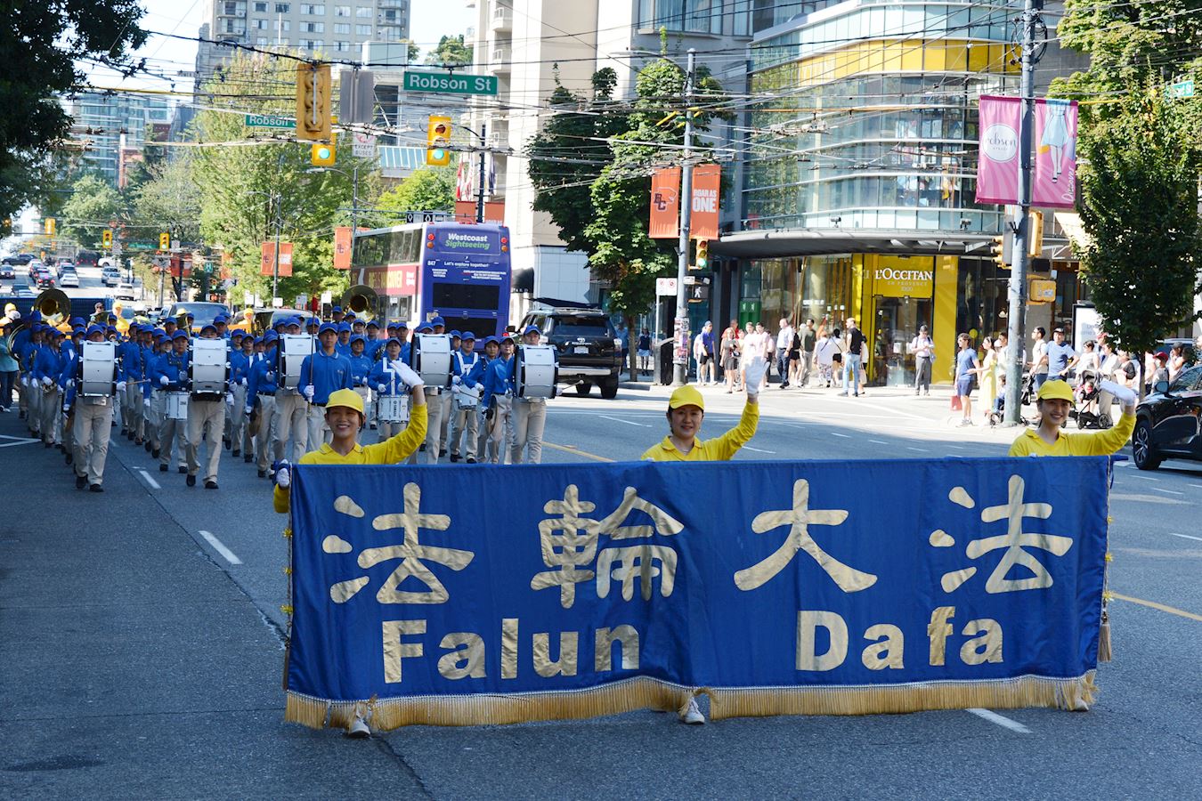 当日,温哥华阳光明媚,晴空万里。在警车的护卫下,游行队伍于上午十一点从温哥华艺术馆南侧广场出发,伴着法轮大法天国乐团正气浩然的鼓乐,还有各种横幅方阵。队伍缓缓走过温哥华市中心最繁华的街道,包括加拿大广场(Canada Place)、五帆酒店、煤气镇蒸汽钟(Gastown Steam Clock)、滨海站大楼(Waterfront Station)等众多著名景点。 游行队伍吸引了众多民众驻足观看,许多路人拿出手机,拍照和录制视频,更有民众看到“解体中共、结束共产党跨国镇压法轮功”等横幅内容后,竖起大拇指致意,并向游行队伍鼓掌赞许。有游客表示中共这场迫害是耻辱,我们必须抵制它们跨国镇压。  图2~8:二零二五年八月二十四日,温哥华法轮功学员在市中心举行游行,呼吁社会各界关注,共同制止中共对法轮功长达二十六年的残酷迫害,并揭露中共将镇压延伸到海外。 |